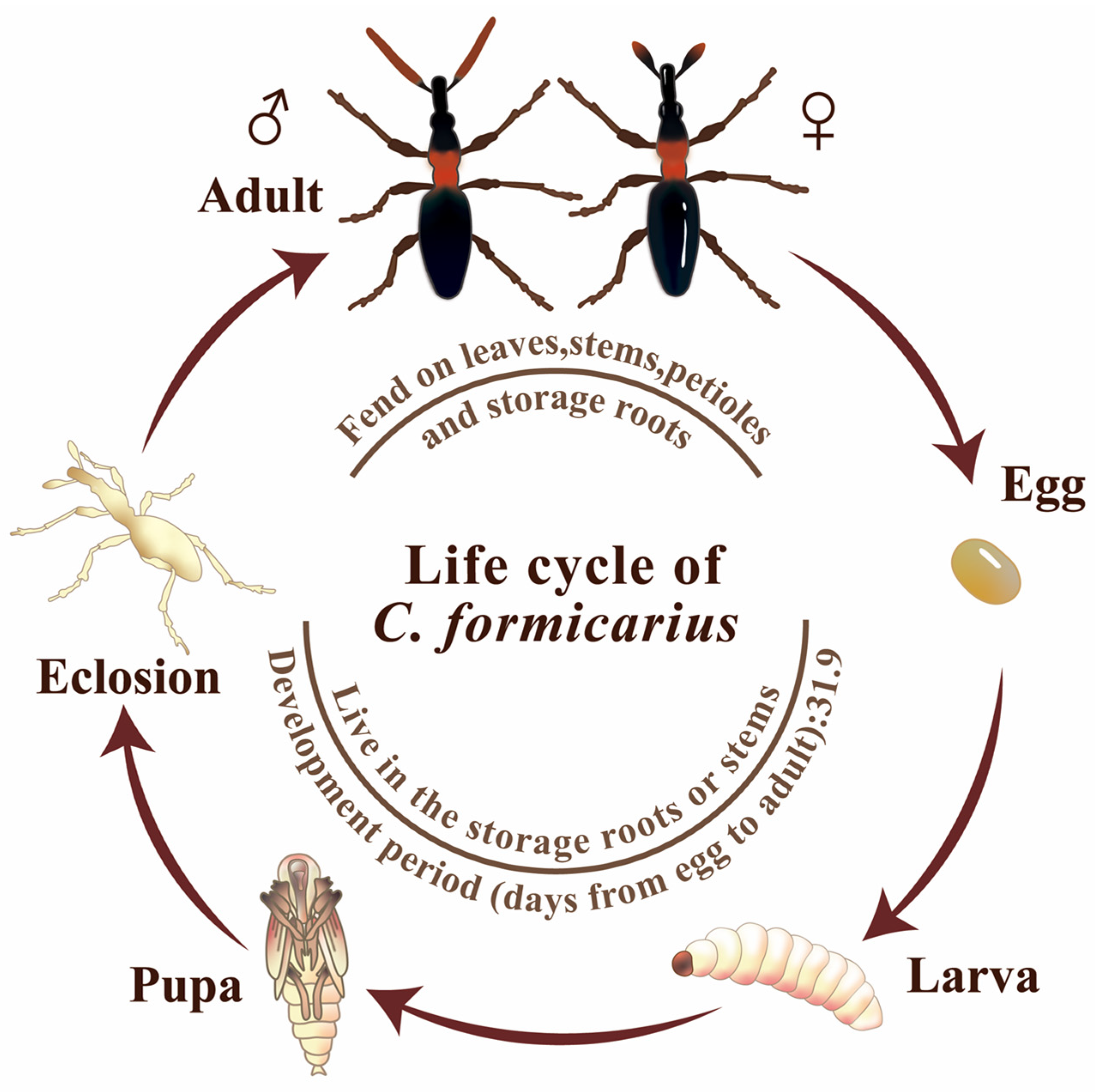 - Chen, J.; Stout, M.J.; Beuzelin, J.; Smith, T.P.; LaBonte, D.; Murray, J.M.; Davis, J.A. Host preference of sweet potato weevil, Cylas formicarius elegantulus (Summers): An example of hopkins host-selection principle. Arthropod. Plant Interact. 2019, 13, 779–786. [Google Scholar] [CrossRef]