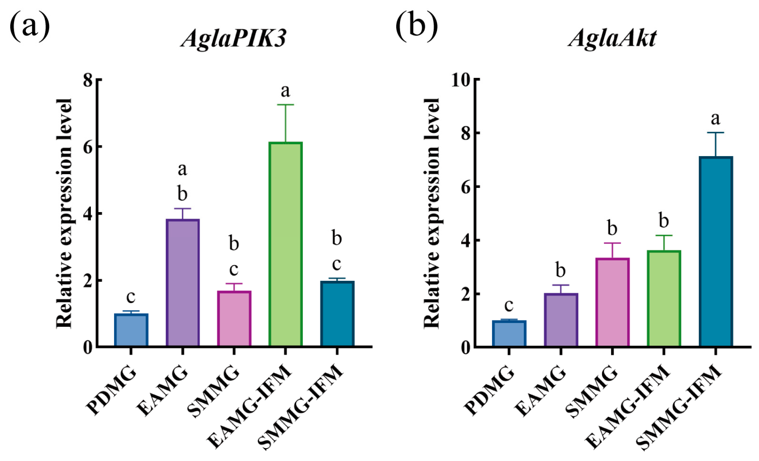 3.3. Differential Expression Analysis of the AglaAkt Gene in Different Treatment Groups