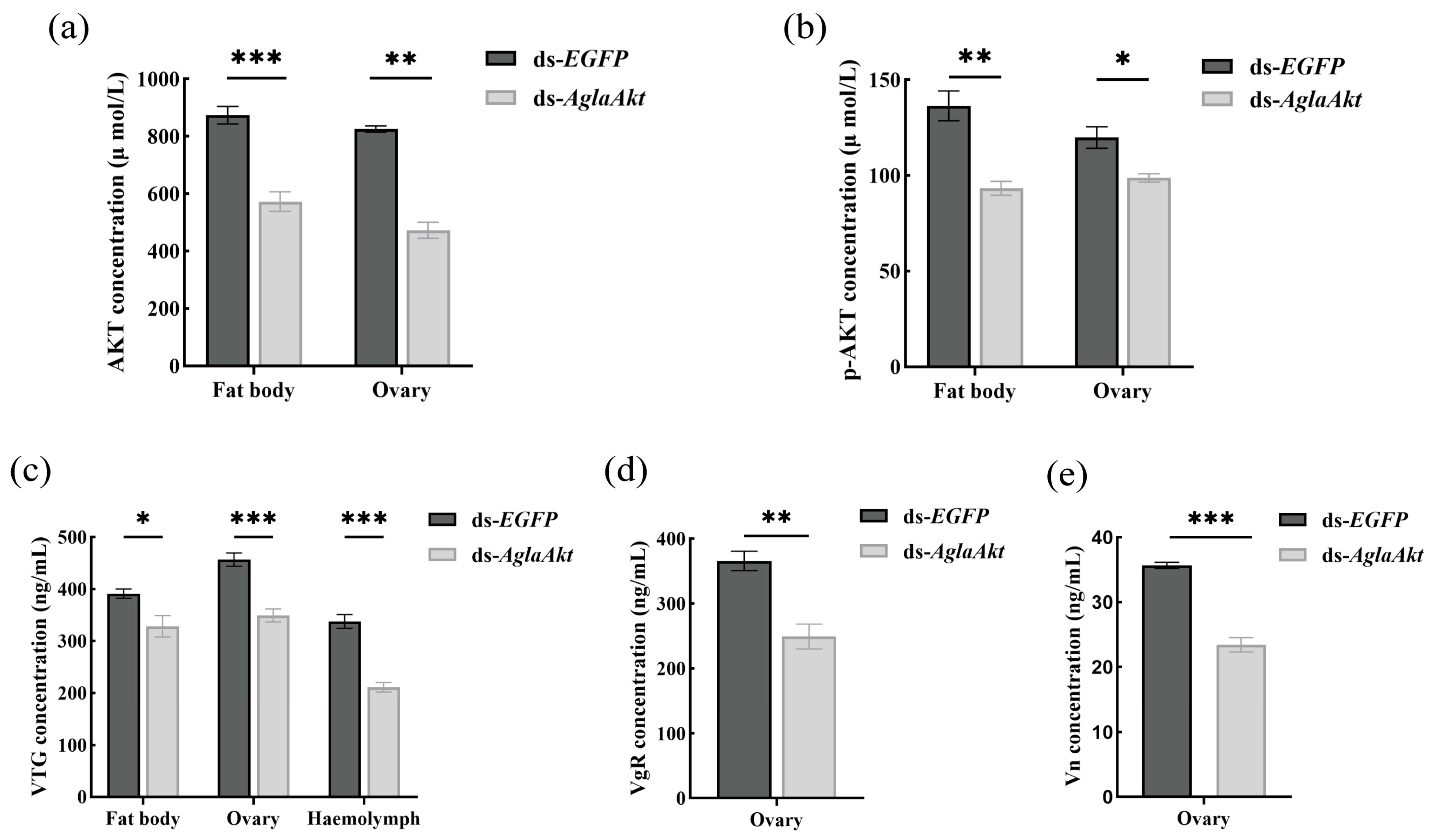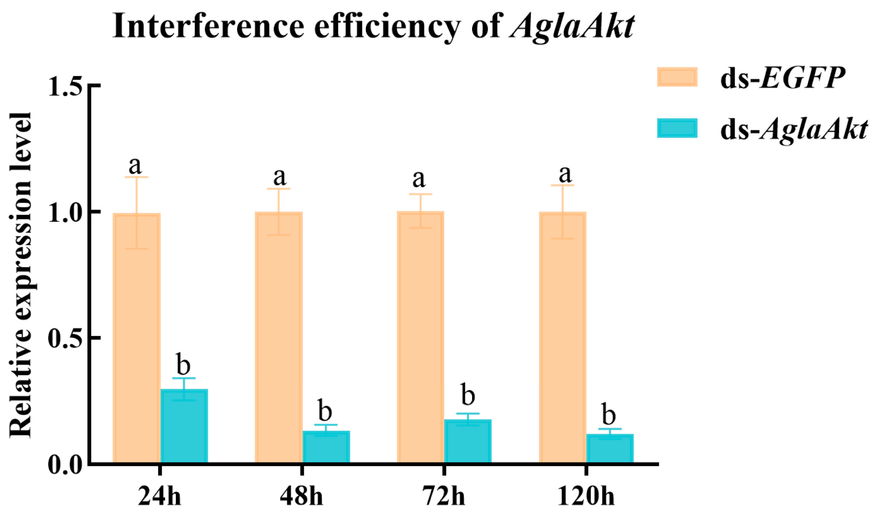 3.4. Functional Analysis of AglaAkt Genes by RNAi Silencing