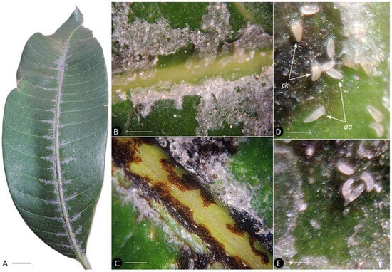 Webbing of eriophyoid mites on the upper surface of mango leaves. (A) Young leaf showing early mite webbing on the petiole, along the midrib and base of the secondary veins. (B) Semitransparent young webbing along the secondary vein of a young leaf. (C) Necrotic spots under webbing along the midrib of an older leaf. (D) Mixed colony of Cisaberoptus kenyae (ck) and Aceria aegyptindicae (aa). (E) Three adults and one nymph of Ac. aegyptindicae under young webbing. Note: webbing was partially removed (C–E) to expose necrotic spots and mites. Scale bar: (A) 1 cm; (B,C) 1 mm; (D,E) 200 µm.