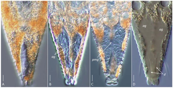 CLSM of C. kenyae from Vietnam revealed a small subrectangular frontal lobe of the prodorsal shield 4–5 µm long (Figure 5A) and outlines of a large, unpaired gland associated with the motivator (Figure 5B, upg), a structure rarely observed under conventional light microscopy. A tiny cuticular lateral folding of the caudal lobe (Figure 5D,E, arrow) was registered in all specimens.