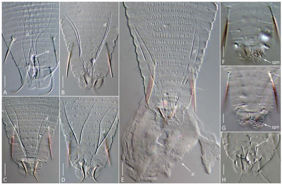 DIC images of the silk-producing apparatus in completely cleared (Hoyer’s medium) females (A–G) and males (H) of Aceria aegyptindicae (A) and Aculops knorri (B–H). Abbreviations: d—ducts of the anal glands; re—putative rectum filled with silk; si—silk extruded from the silk-producing organs of a slightly compressed mite; spn—areas of porose cuticle (the spinneret) on the caudal lobes. Scale bar: (A–D) 5 µm; (E–H) 3 µm.