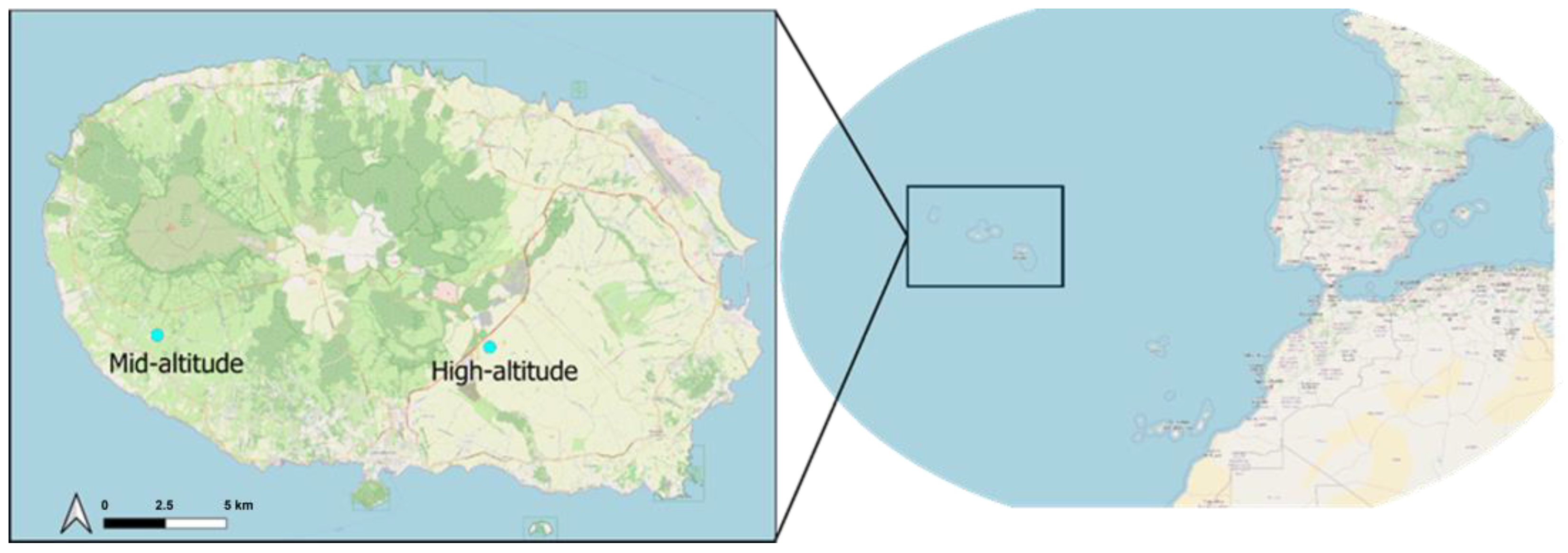 - Wallon, S.; Melo, C.; Tsafack, N.; Elias, R.B.; Borges, P.A.V. Assessing the Effects of Climate Change on Arthropod Abundance in Azorean Pastures: PASTURCLIM Project’s Baseline Monitoring Data. Biodivers. Data J. 2023, 11, e103723. [Google Scholar] [CrossRef]