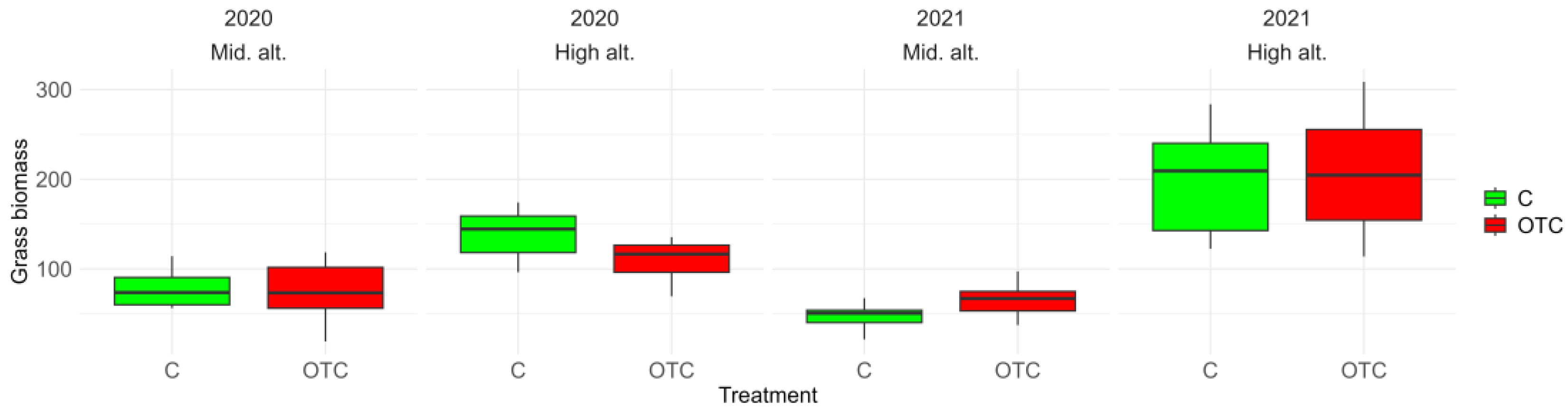 | Effect of experimental warming (OTC) | GLM (Poisson) Fixed: Treatment + Grass biomass | Random effects could not be reliably estimated for count data with limited grouping levels | |