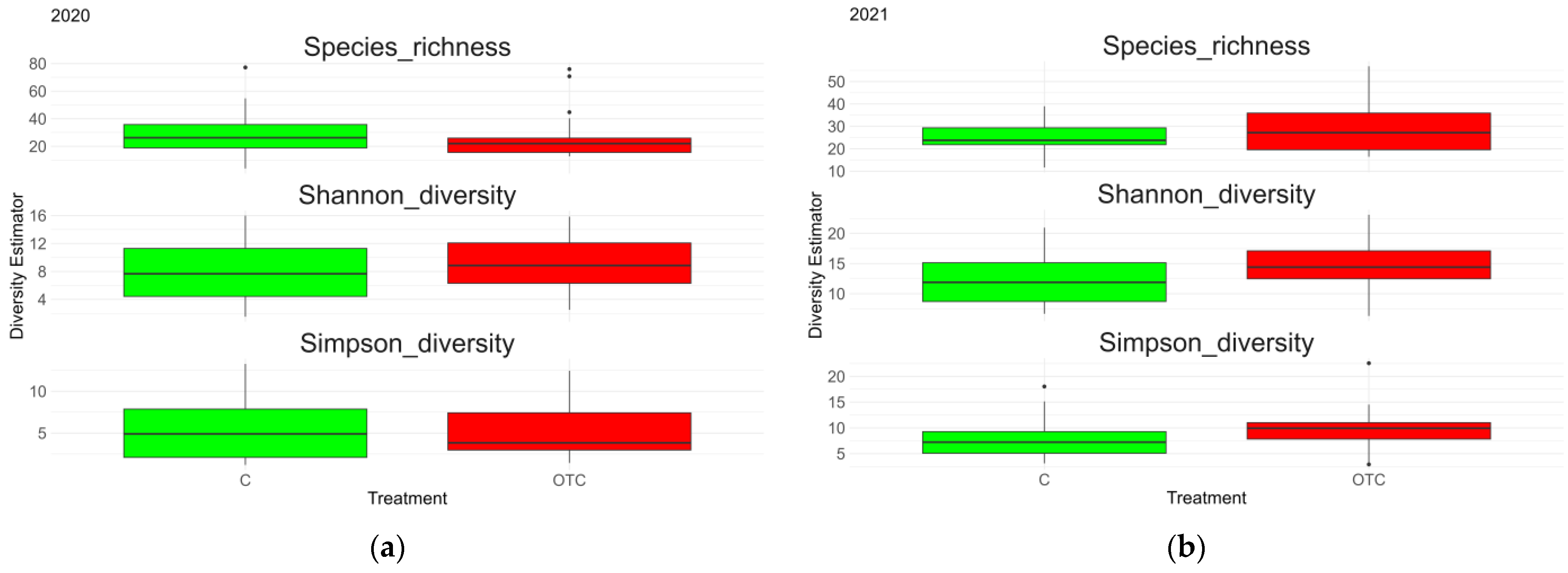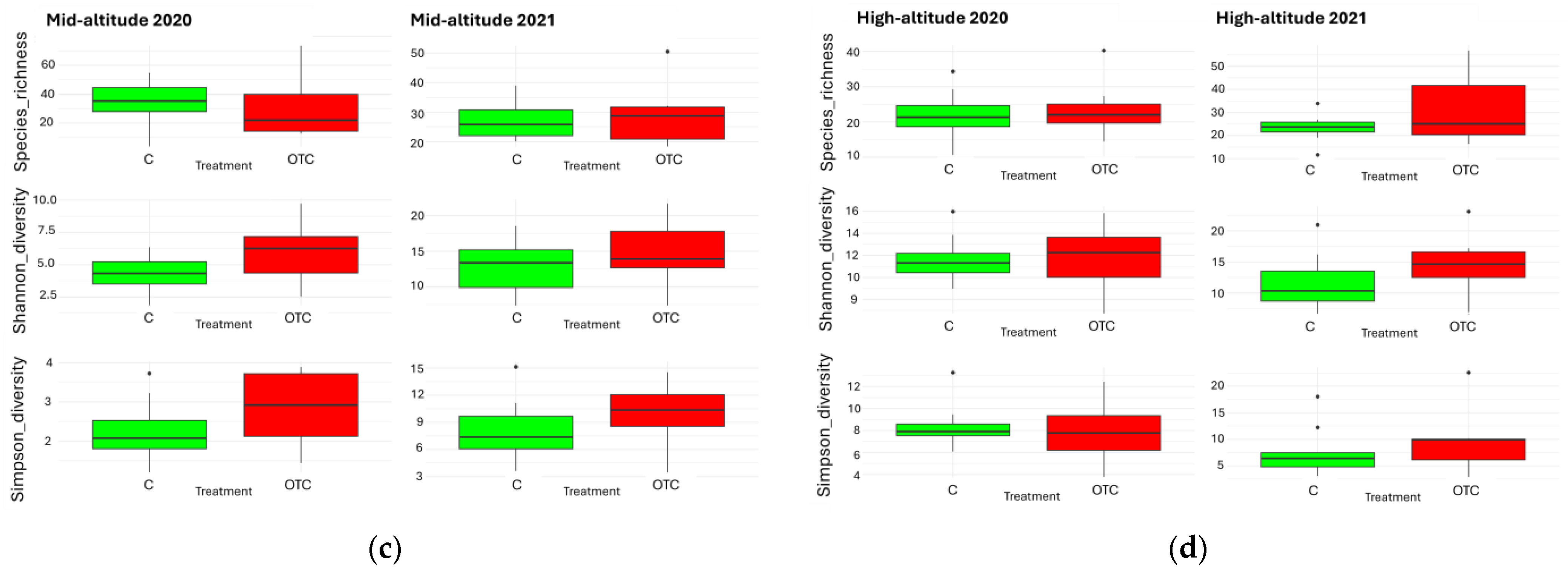 | Species richness | GLM (experimental warming effects) | Treatment | 0.000 | 0.054 | 0.002 | 0.999 |