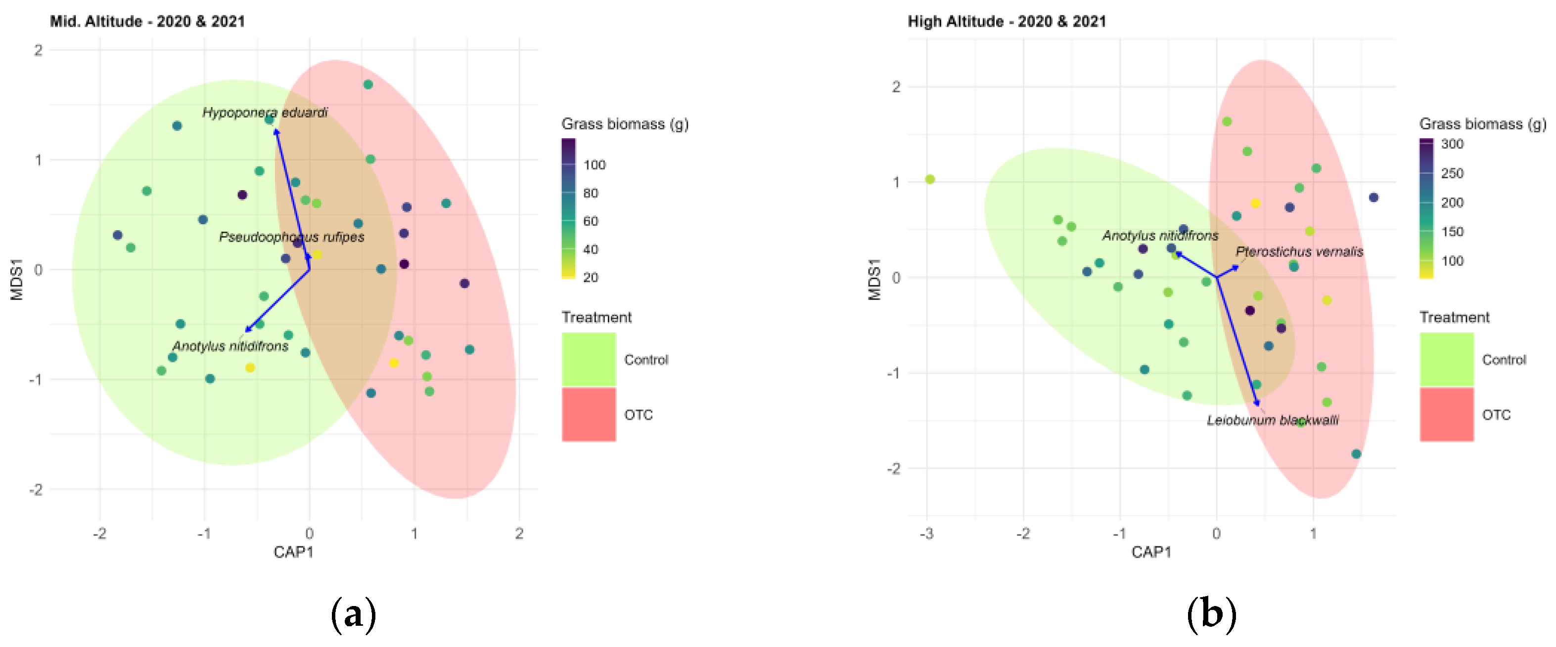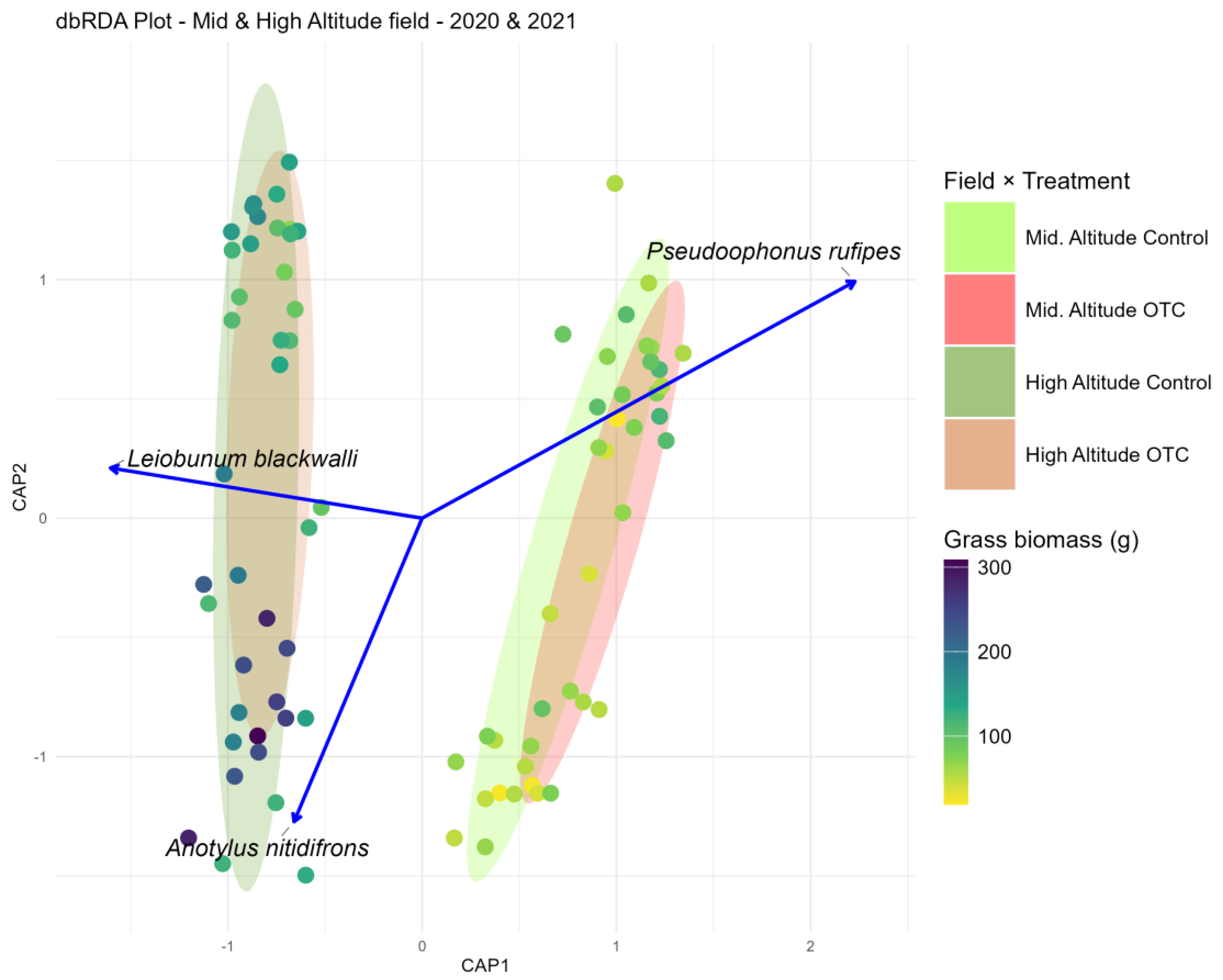 | Shannon diversity (Hill q = 1) | Combined effects on diversity | LMM (Gaussian) Fixed: Treatment + Year + Grass biomass Random: Field (Elevation) | Model was not singular and allowed accounting for elevation-related grouping |