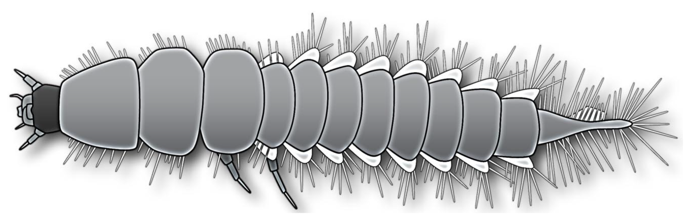- Stehr, F.W. Chapter 148—Larva. In Encyclopedia of Insects; Resh, V.H., Cardé, R.T., Eds.; Academic Press: Burlington, MA, USA, 2009; pp. 551–552. [Google Scholar] [CrossRef]