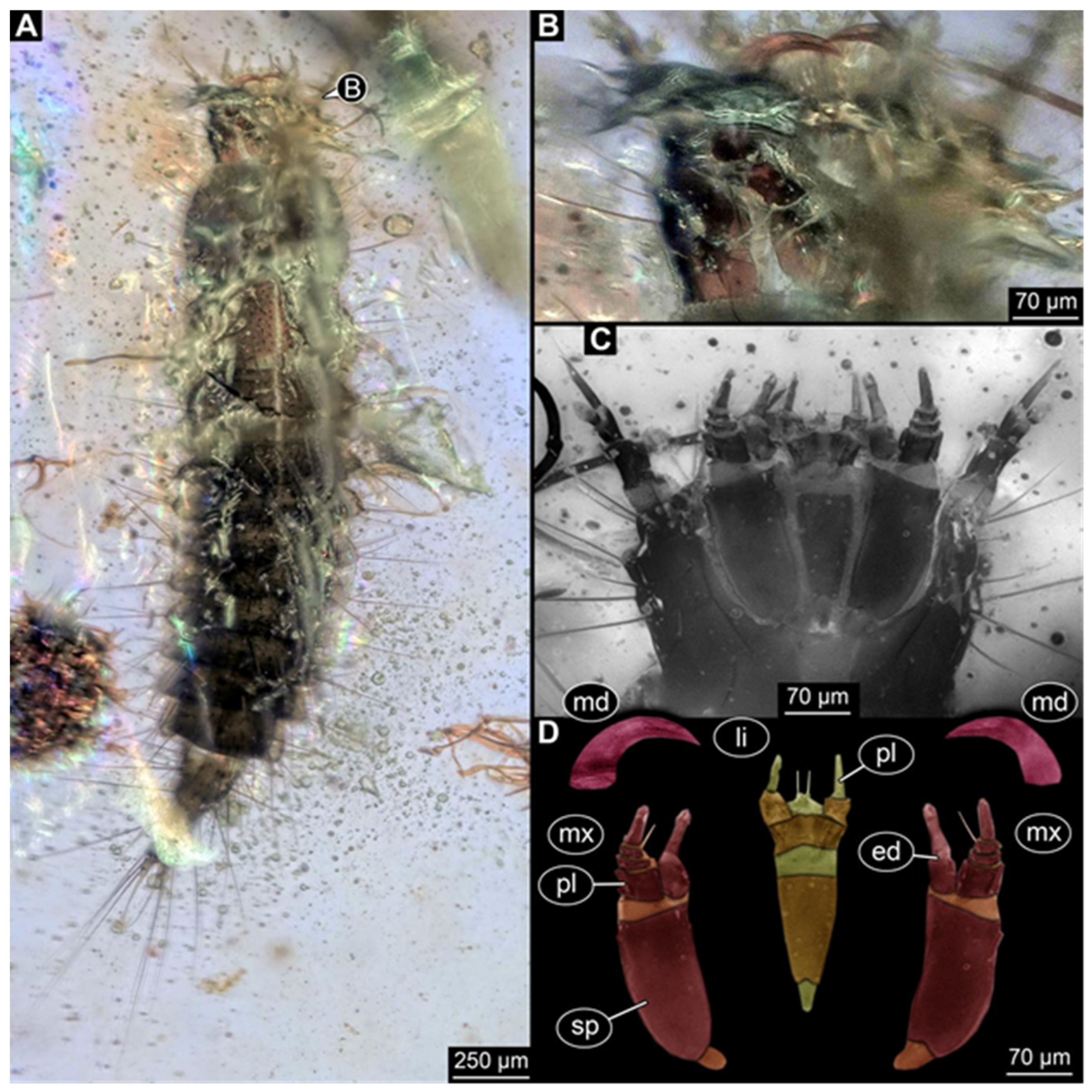 - Linhart, S.J.; Zippel, A.; Haug, G.T.; Müller, P.; Haug, C.; Haug, J.T.; Braig, F. New predatory beetle larvae from about 100 million years ago and possible niche differentiation effects in the Kachin amber forest. Swiss J. Palaeontol. 2025, 144, 54. [Google Scholar] [CrossRef]