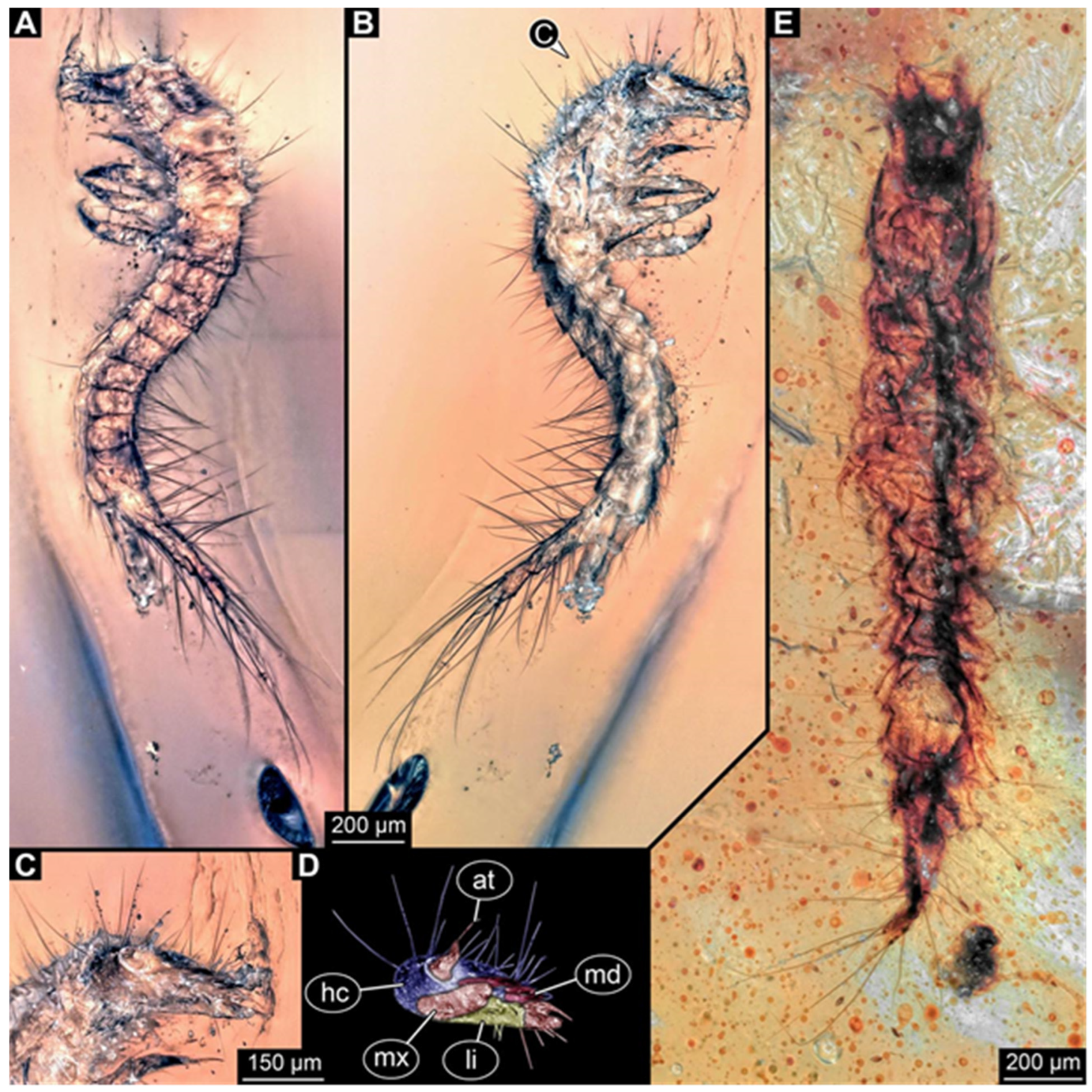 - Zippel, A.; Haug, C.; Hoffeins, C.; Hoffeins, H.-W.; Haug, J.T. Expanding the record of larvae of false flower beetles with prominent terminal ends. Riv. Ital. Paleontol. Stratigr. 2022, 128, 81–104. [Google Scholar] [CrossRef] [PubMed]