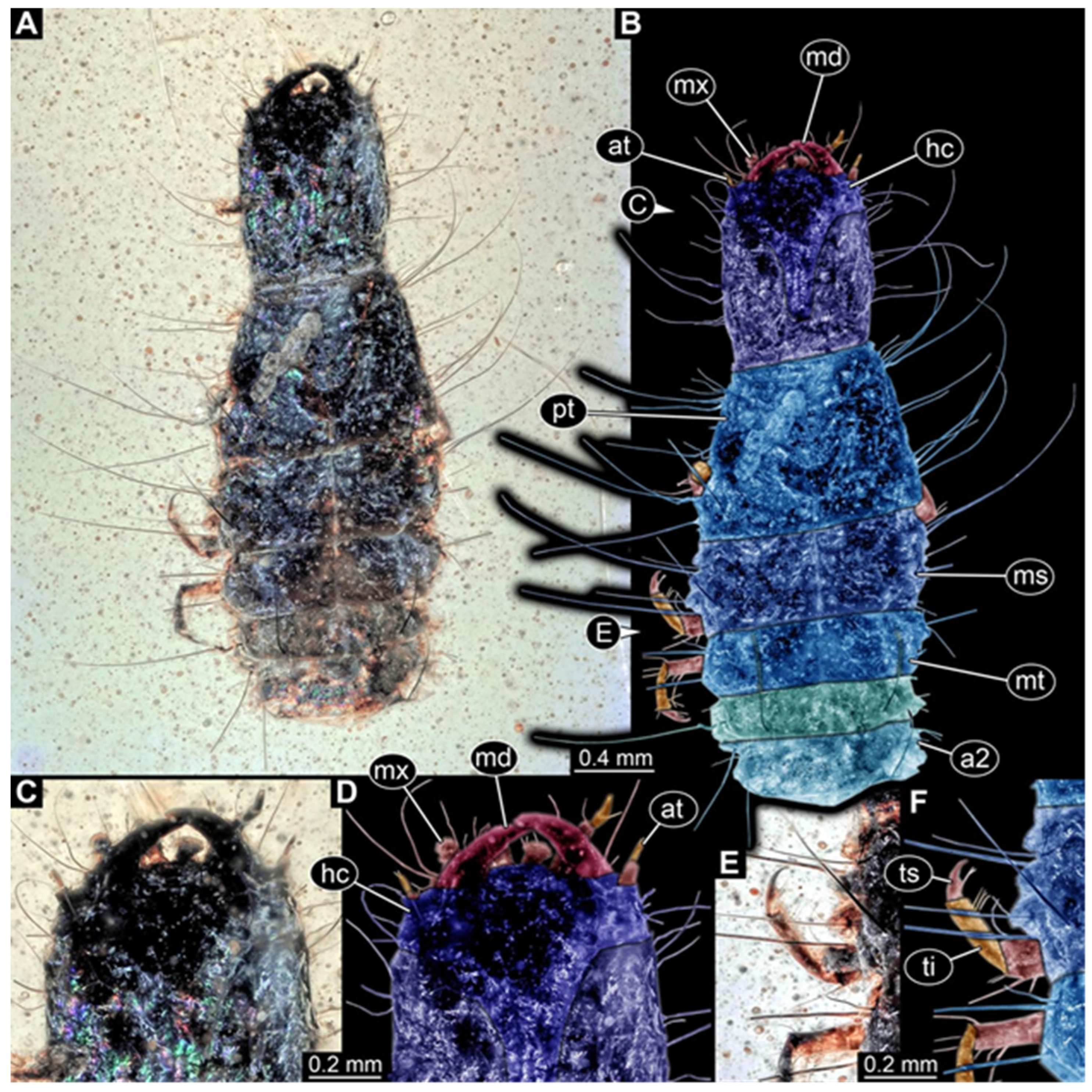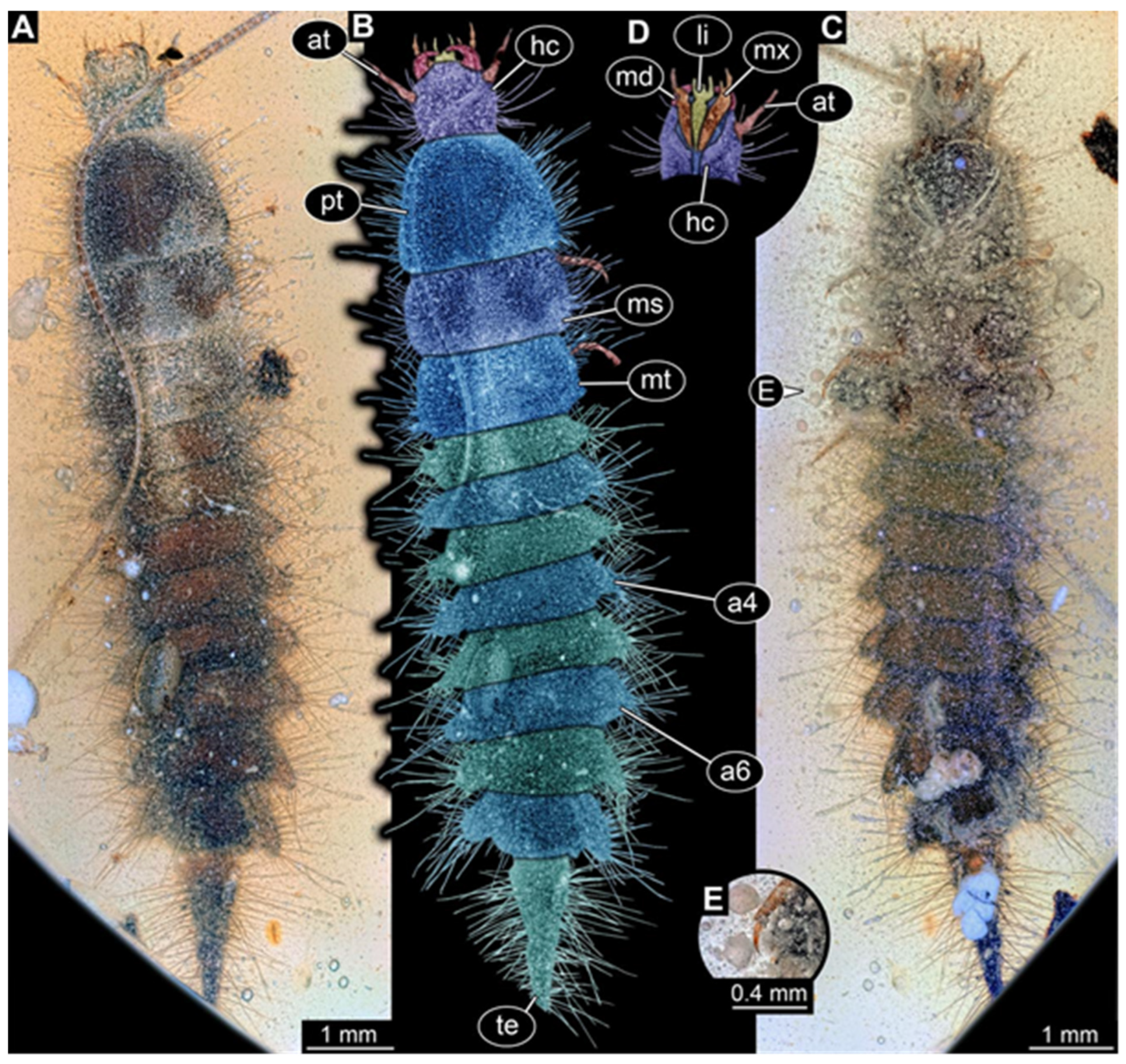 - Zippel, A.; Haug, C.; Müller, P.; Haug, J.T. The first fossil false click beetle larva preserved in amber. PalZ 2023, 97, 209–215. [Google Scholar] [CrossRef]