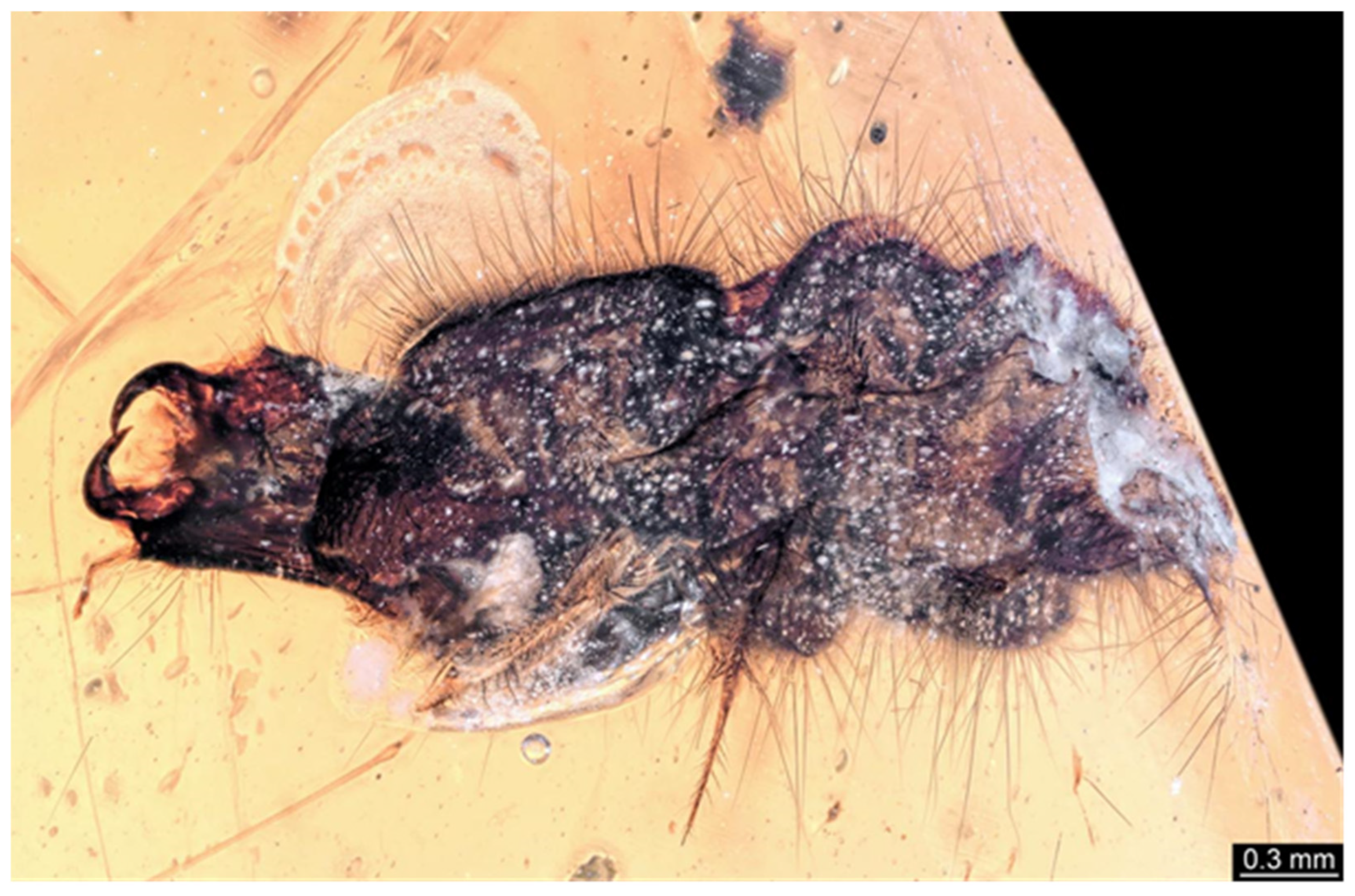 - Le Cadre, J.; Gauweiler, J.; Haug, J.T.; Arce, S.I.; Baranov, V.; Hammel, J.U.; Haug, C.; Kaulfuss, U.; Kiesmüller, C.; McKellar, R.C.; et al. New amber fossils indicate that larvae of Dermestidae had longer defensive structures in the past. Insects 2025, 16, 710. [Google Scholar] [CrossRef]