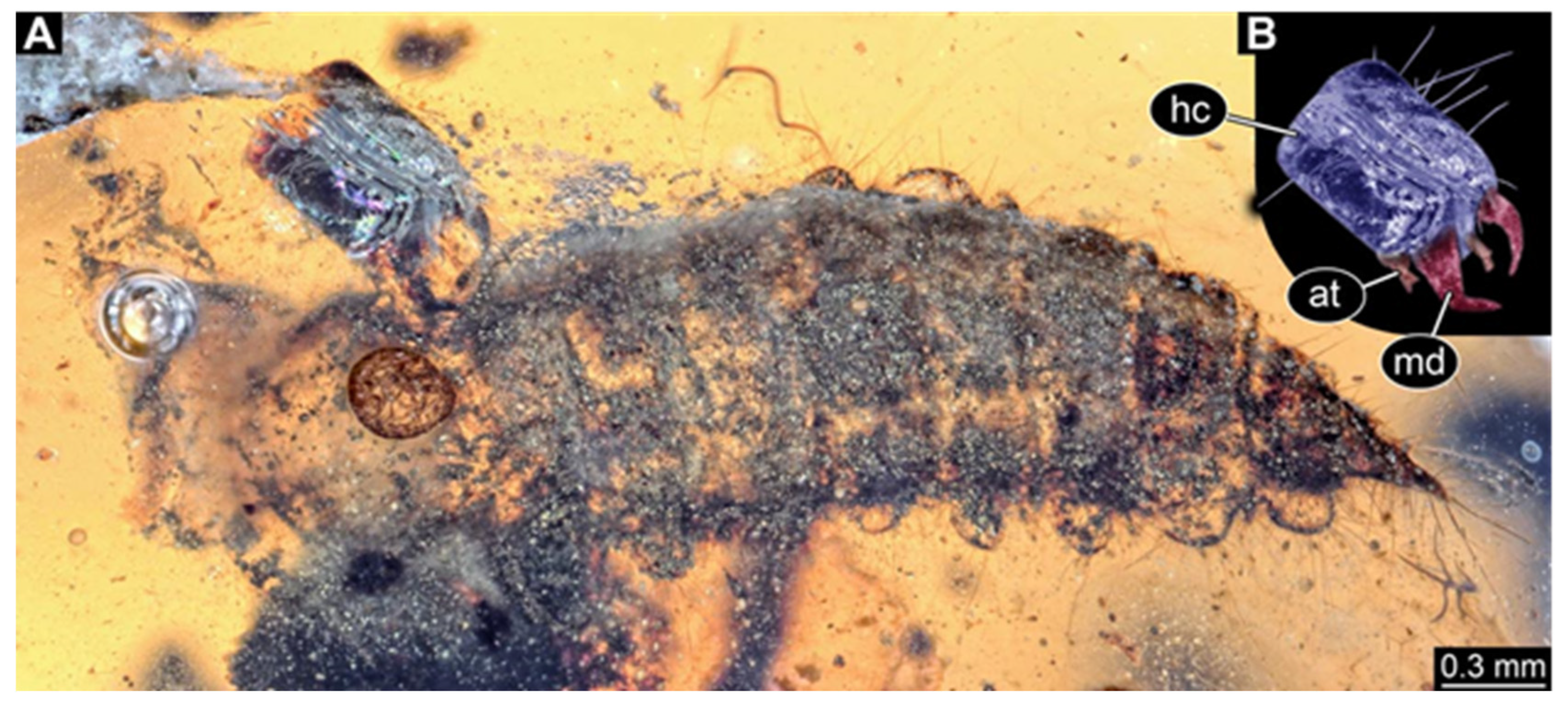 - Haug, C.; Zippel, A.; Müller, P.; Haug, J.T. Unusual larviform beetles in 100-million-year-old Kachin amber resemble immatures of trilobite beetles and fireflies. PalZ 2023, 97, 485–496. [Google Scholar] [CrossRef]