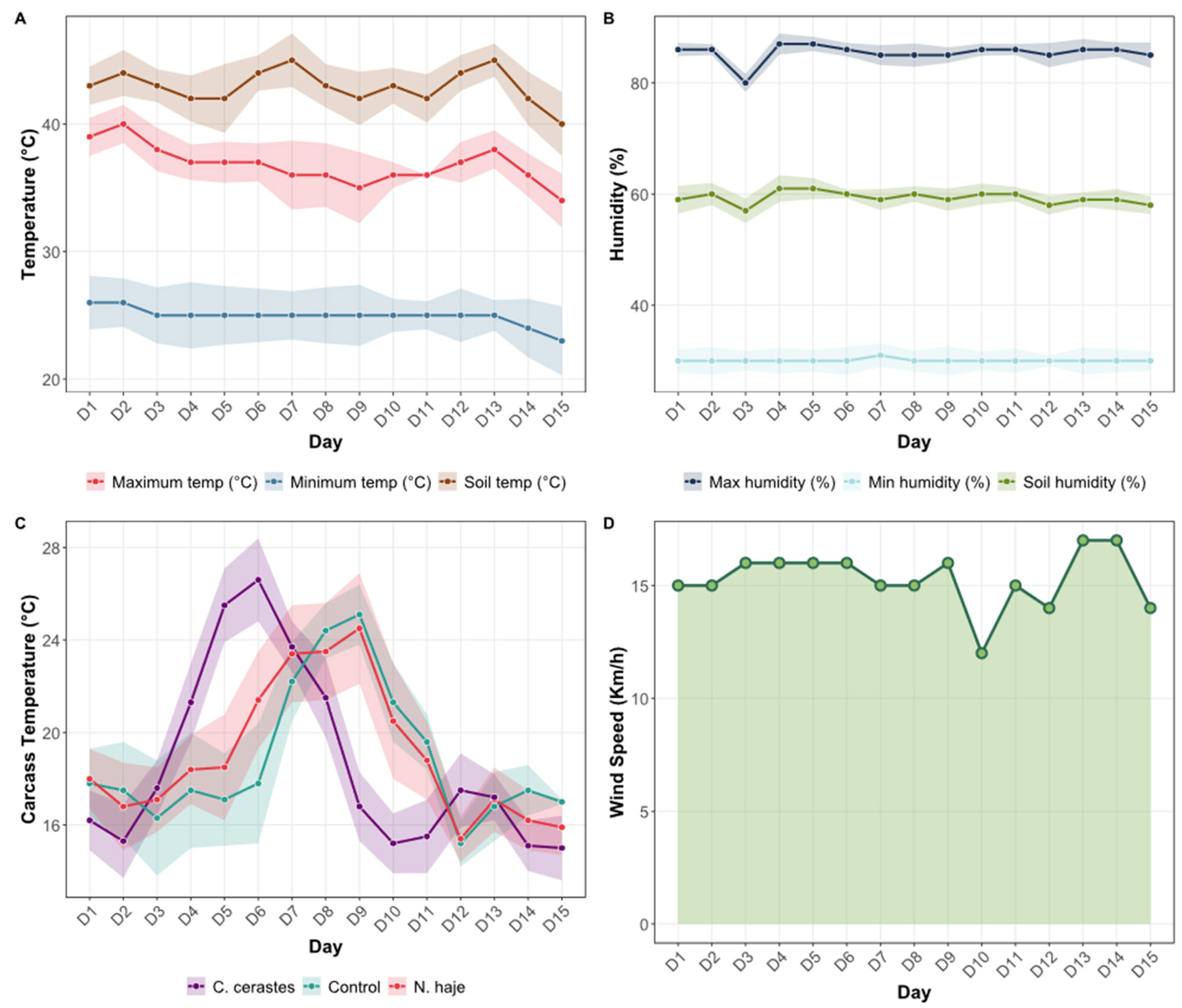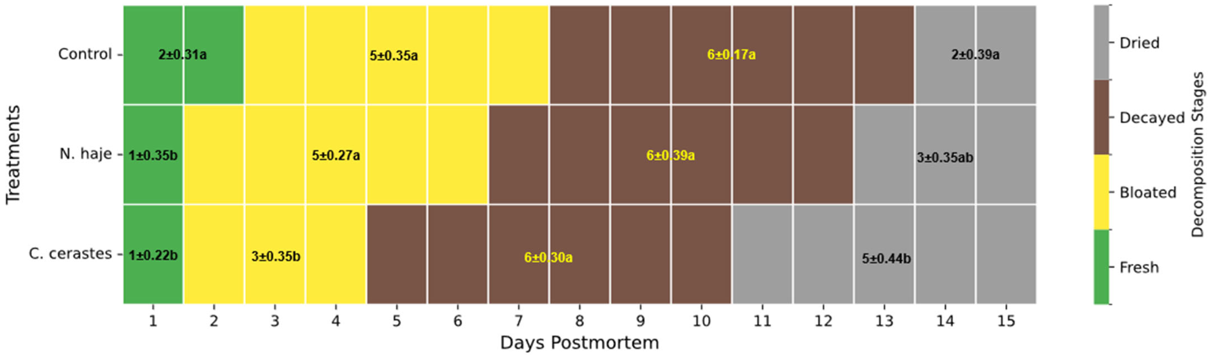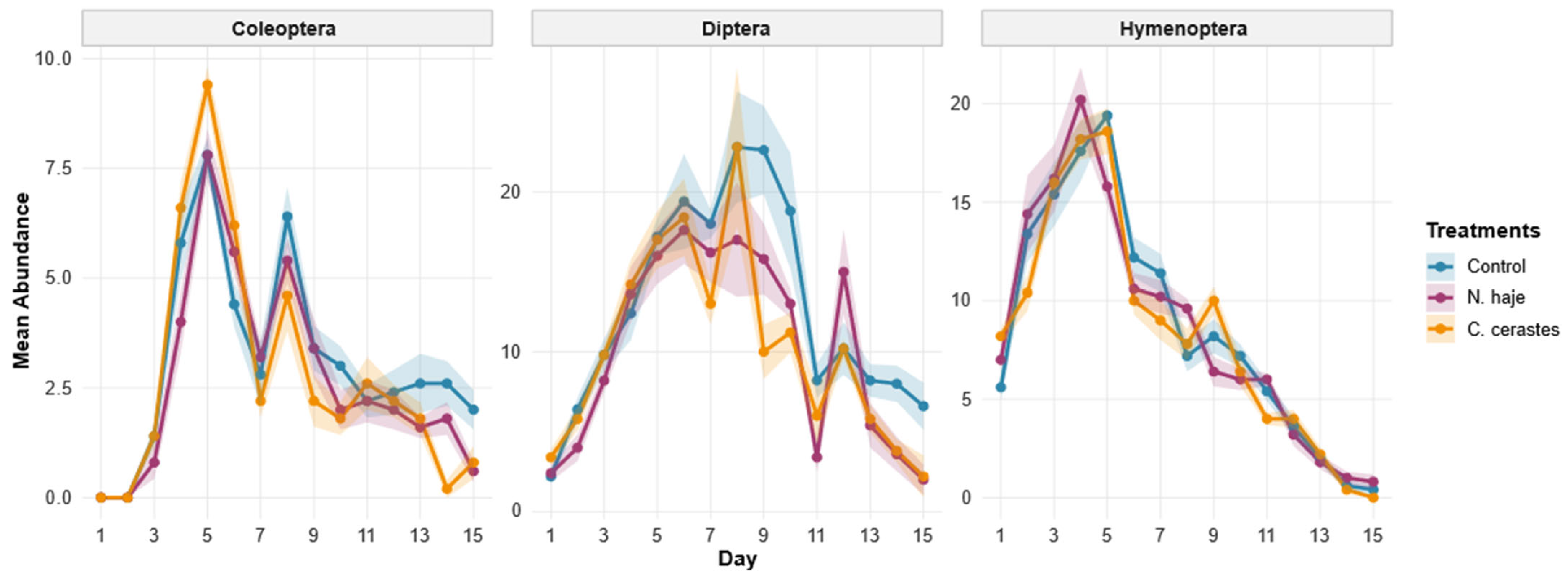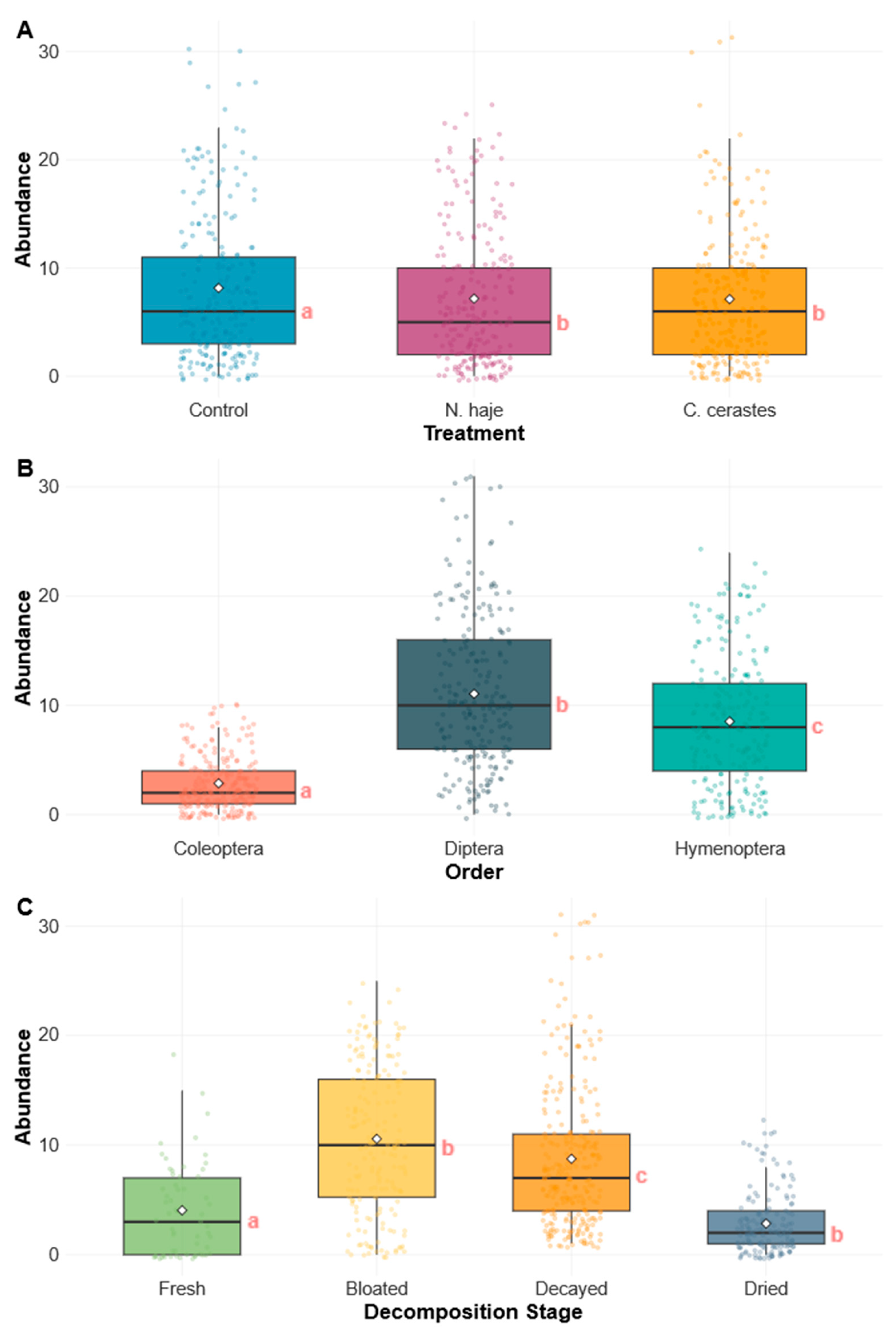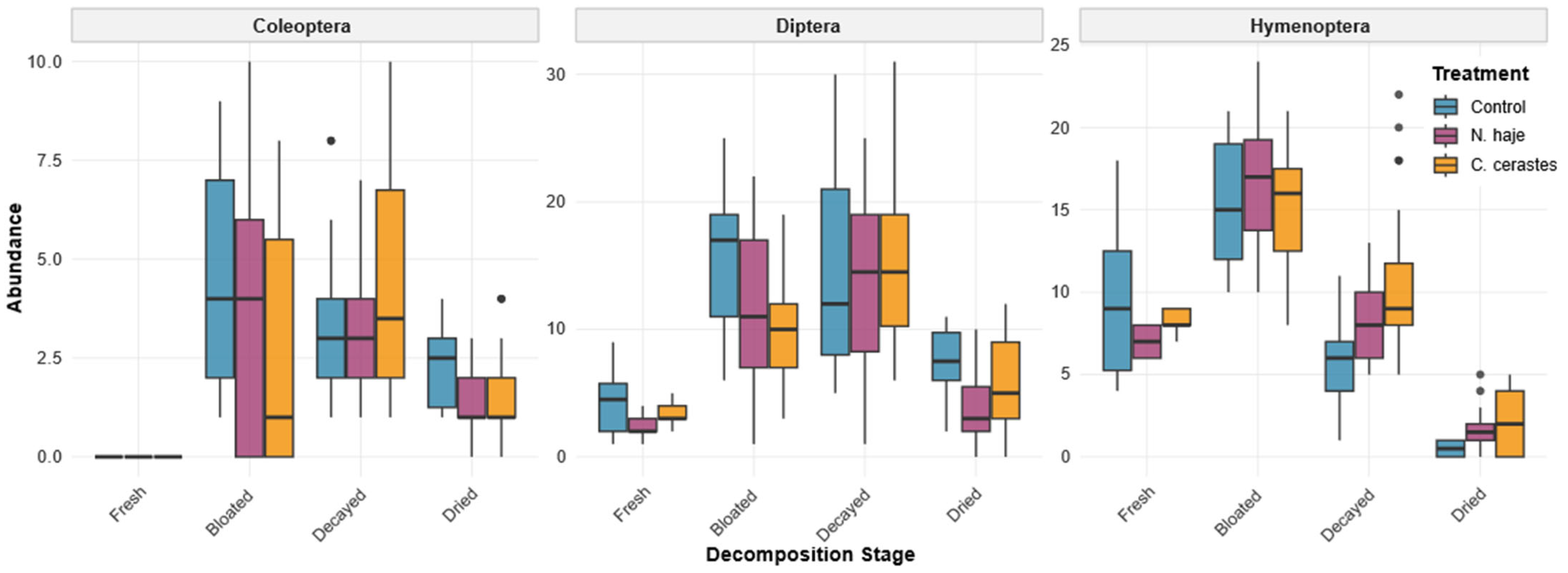 Chicago/Turabian StyleKhalil, Abdelwahab, Eman E. Zaher, Mustafa M. Soliman, Ashraf M. Ahmed, El-Sayed H. Shaurub, Areej A. Al-Khalaf, and Mahmoud M. Zidan. 2026. "Comparative Effects of Snake Envenomation on Rabbit Carcass Decomposition and Insect Succession in a Forensic Context" Insects 17, no. 3: 274. https://doi.org/10.3390/insects17030274