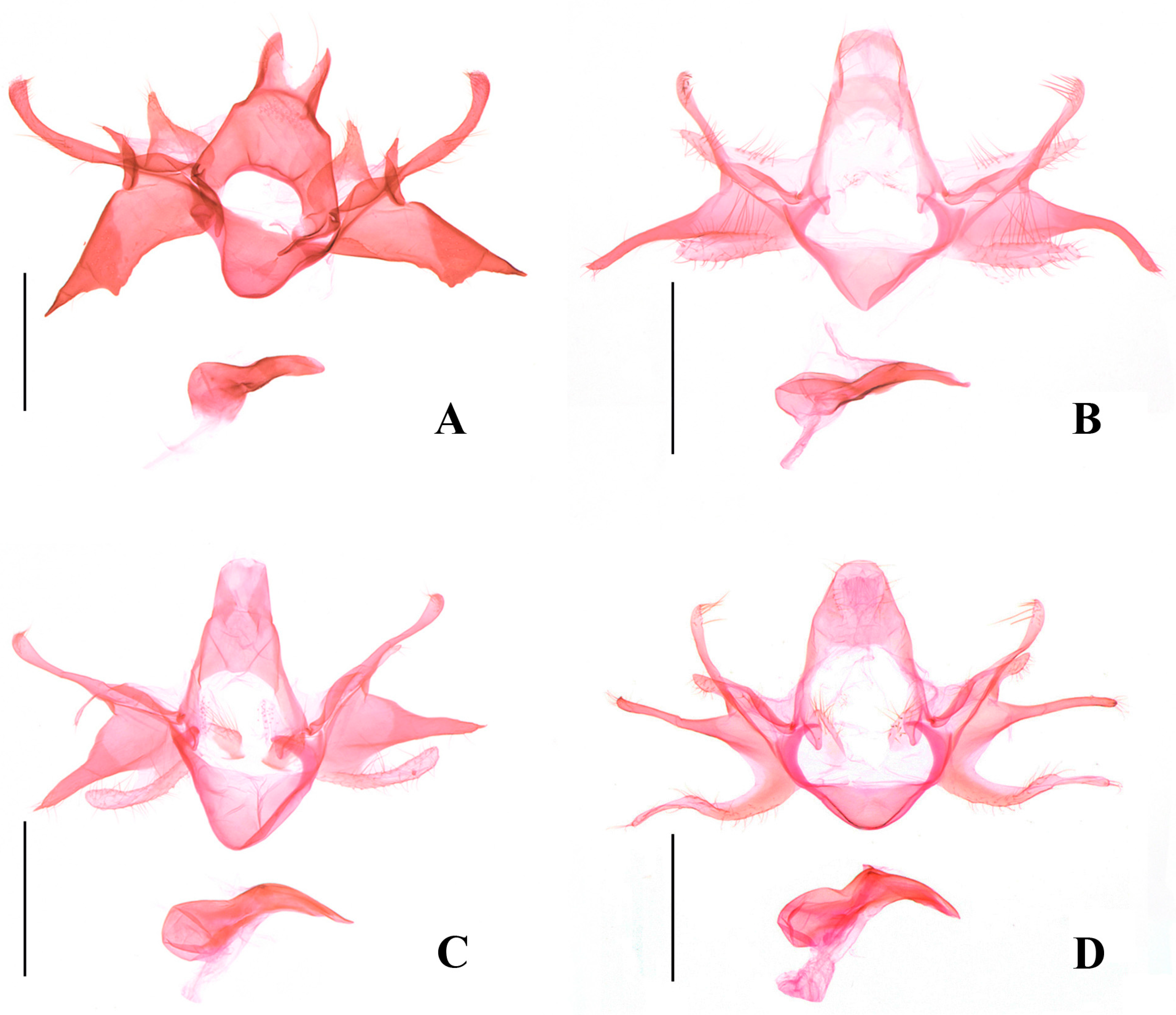 Uncus with a lateral process, saccus triangular and narrowly pointed at apex (this paper,