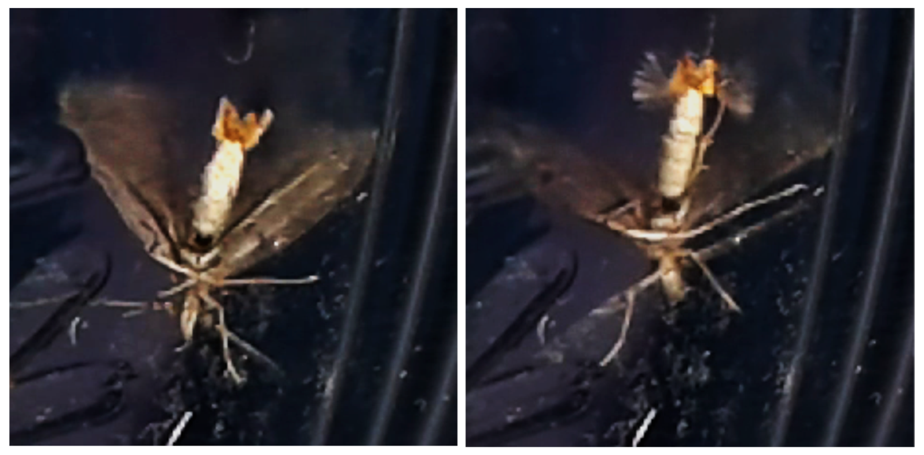 - Poppy, G.M.; Birch, M.C. Evidence of the eversion of Mamestra brassicae (Lepidoptera: Noctuidae) hair-pencils during courtship. J. Insect Behav. 1994, 7, 885–889. [Google Scholar] [CrossRef]