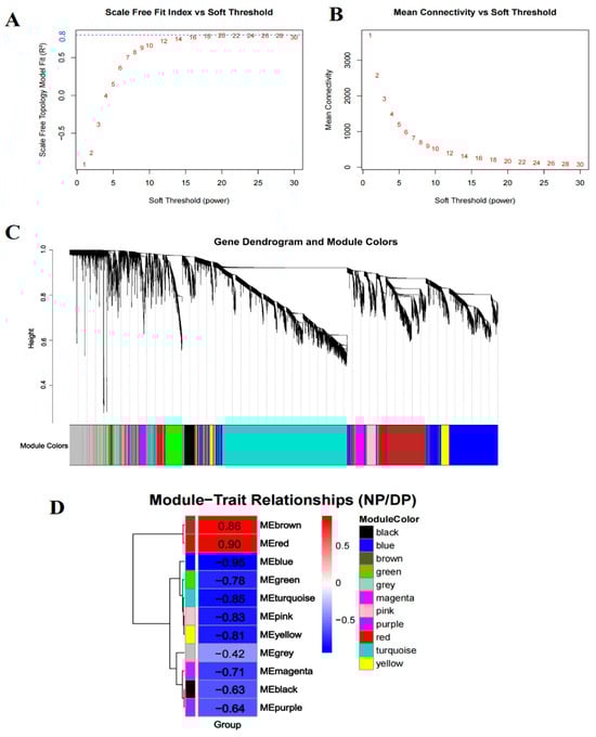 Co-expression analysis for all differentially expressed genes at three time points. (A,B) The scale-free fit index and mean connectivity of WGCNA. (C) The gene dendrogram and module colors. (D) The module-trait relationships. Red fill color indicates a positive correlation with diapause, while blue fill color represents a negative correlation.