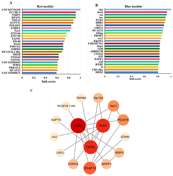 Screening of hub genes. The TOP25 hub genes in red (A) and blue (B) modules ranked by hub.score from MEGENA Network. (C) PPI Analysis of hub genes. The darker of fill color and the larger of node size represent the higher connectivity of genes.