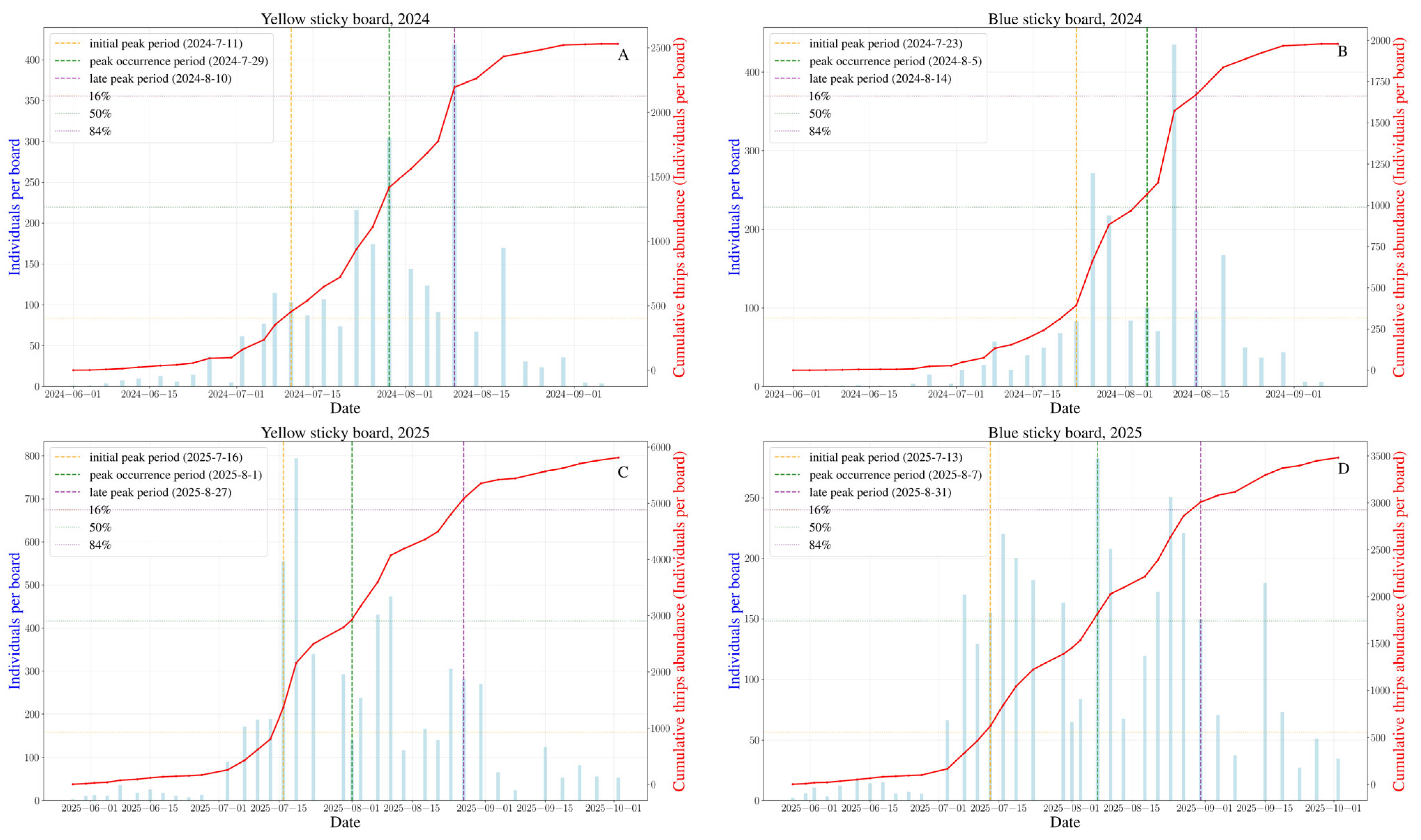 | Year | Sticky Board Color | Initial Peak Period | Peak Occurrence Period | Late Peak Period | Mathematical Expressions | R2 | RMSE |