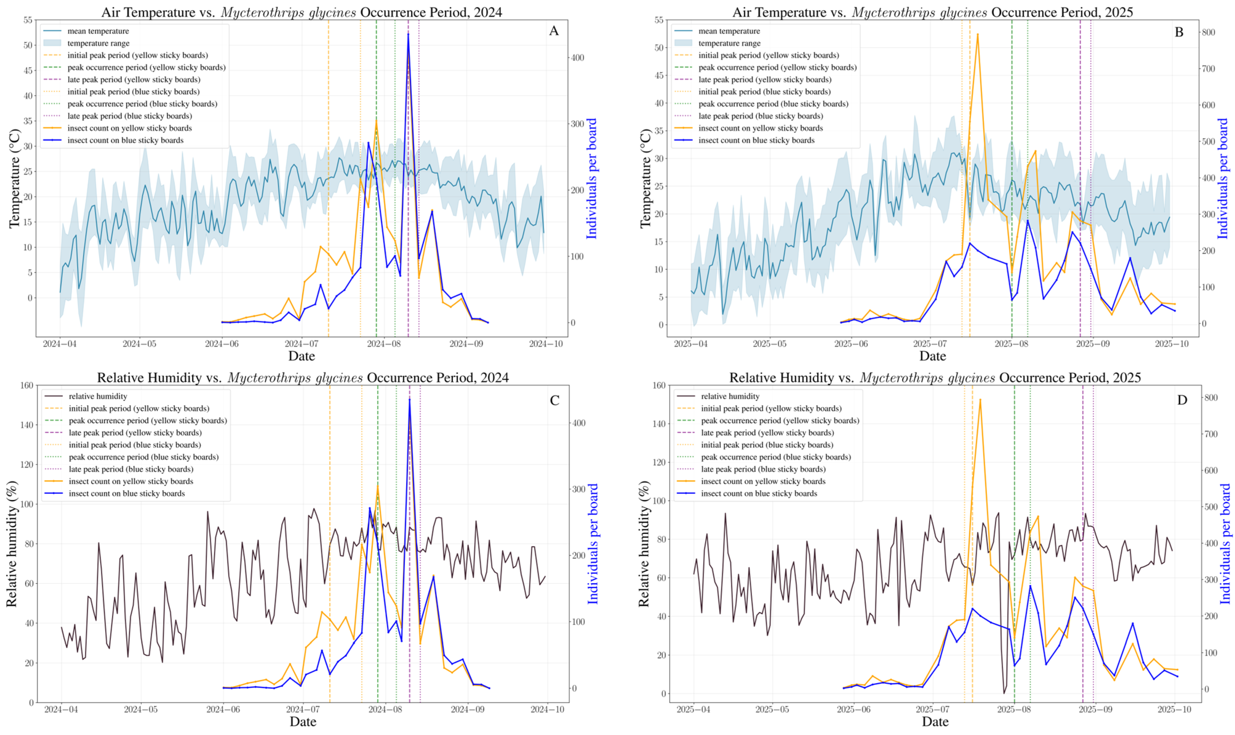 Zhou Y, Pei T, Li X, Zhang L, Du Z, Zhao Y, Wang L, Gao Y. Occurrence Dynamics and Chemical Control of Mycterothrips glycines in Soybean Field in Northeast China. Insects. 2026; 17(4):365. https://doi.org/10.3390/insects17040365