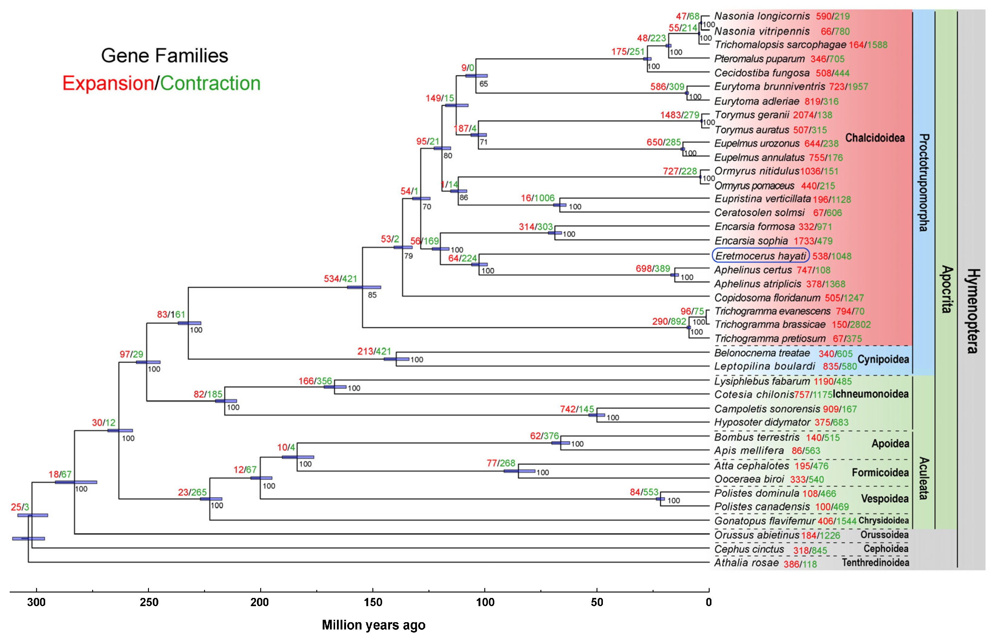 The annotated protein sequences of Er. hayati and 39 other hymenopteran species were used for comparative genomics and phylogenomic analyses. The ingroup comprised 37 Apocrita species: 30 parasitic wasps, including 24 Chalcidoidea species, two Cynipoidea species and four Ichneumonoidea species; and seven non-parasitic wasps, comprising two Apoidea species, two Formicoidea species, two Vespoidea species and one Chrysidoidea species. The outgroups comprised three hymenopteran species, one each from Orussoidea, Cephoidea, and Tenthredinoidea.