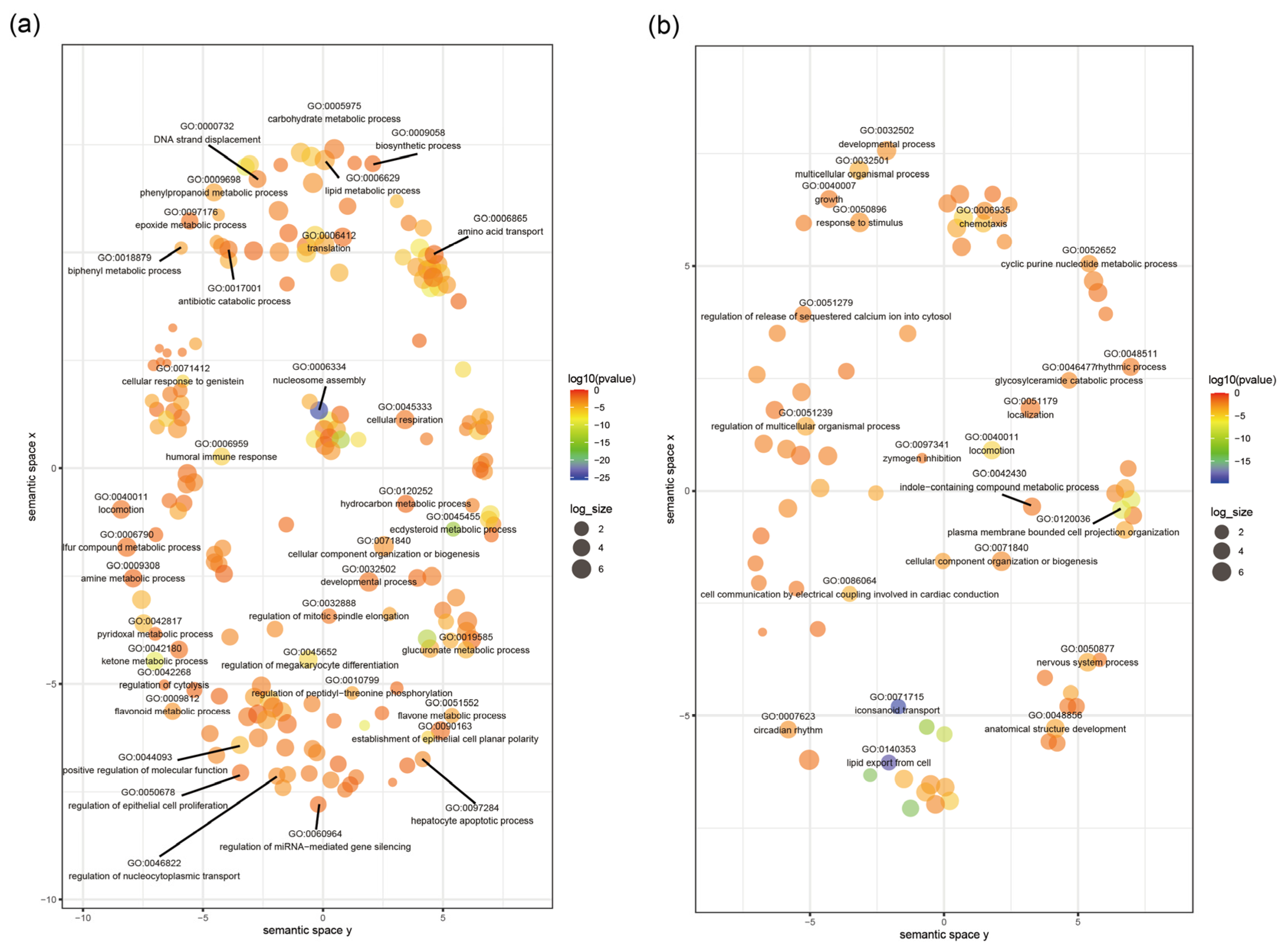 Figure 2. Gene Ontology (GO) enrichment of expanded (a) and contracted (b) orthogroups of Eretmocerus hayati. Different point colors and sizes represent different log10-transformed p-values and the number of annotations for GO term identity in the EBI GOA database, respectively. According to the results of REVIGO analysis, only GO terms with a dispensability score < 0.15 (i.e., the most representative terms in each cluster) are labeled to ensure clarity. Dispensability is defined as the semantic similarity threshold at which a term is merged into a cluster representative.