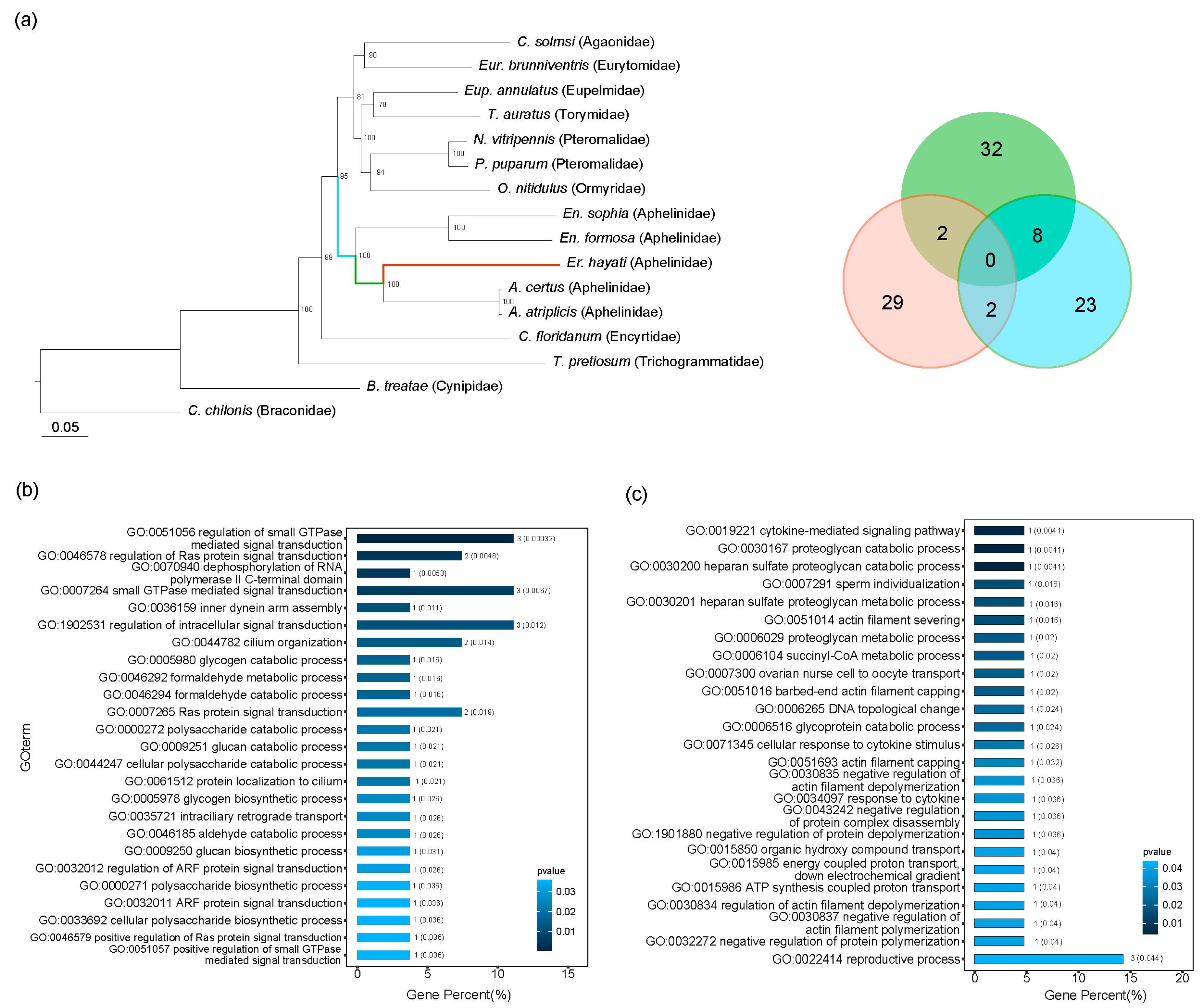 Figure 3. Positive selection gene analysis. (a) Phylogeny of 16 hymenopteran species and the distribution of positively selected genes across the evolutionary branch of Eretmocerus hayati and its ancestral branches. The maximum likelihood (ML) tree was reconstructed based on the single-copy orthologs. The tree includes five species from the family Aphelinidae, along with representative species from each of the nine families within Chalcidoidea included in Figure 1. Cotesia chilonis (Ichneumonoidea) and Belonocnema treatae (Cynipoidea) were used as outgroups. The numbers following branch nodes represent the Bootstrap values. The colors of the areas of the Venn diagram represent different branches of the phylogenetic tree. (b,c) The top 25 enriched GO terms of positively selected genes of Er. hayati and the Aphelinidae ancestor branch node, respectively. The vertical axis represents the GO number and the specific description. The number of genes and p-values in each GO term are marked to the right of the column.