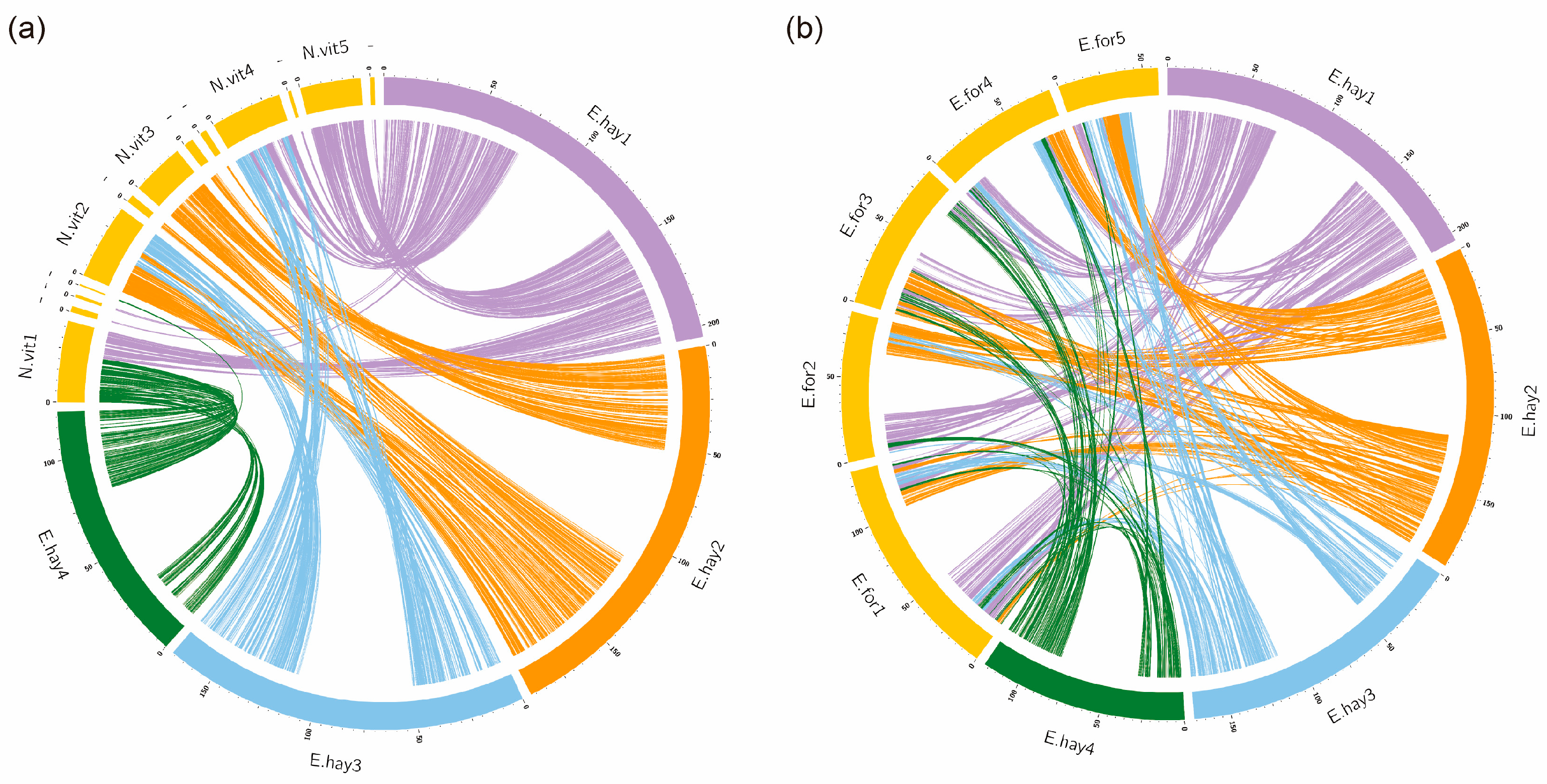 Figure 4. Chromosomal synteny analysis. (a) Chromosome synteny between Er. hayati and N. vitripennis. (b) Chromosome synteny between Er. hayati and En. formosa. The colors of the connecting lines depend on the Er. hayati chromosome on which the gene is located. Owing to the limited space of the diagrams, the species names are abbreviated, followed by the figure of the chromosome number (for example, E.hay1 represents chromosome 1 of Er. hayati). The minus symbol “-” represents the episomal genome sequence that could not be located on chromosomes.