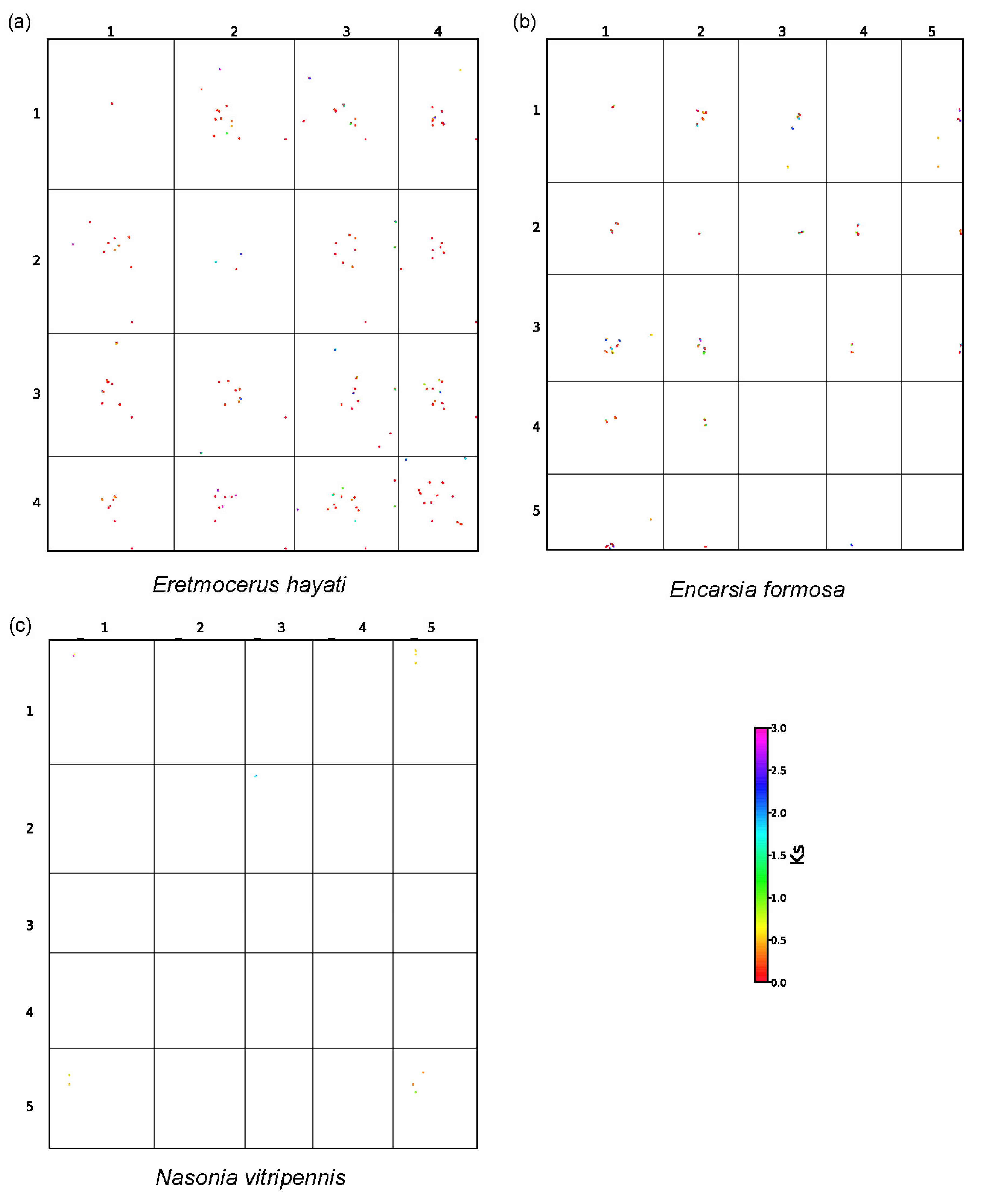 Figure 5. Analysis of chromosome collinearity in (a) Eretmocerus hayati, (b) Encarsia formosa and (c) Nasonia vitripennis. The coordinates are the chromosome numbers. The color of the points represents the Ks value of the collinearity regions.