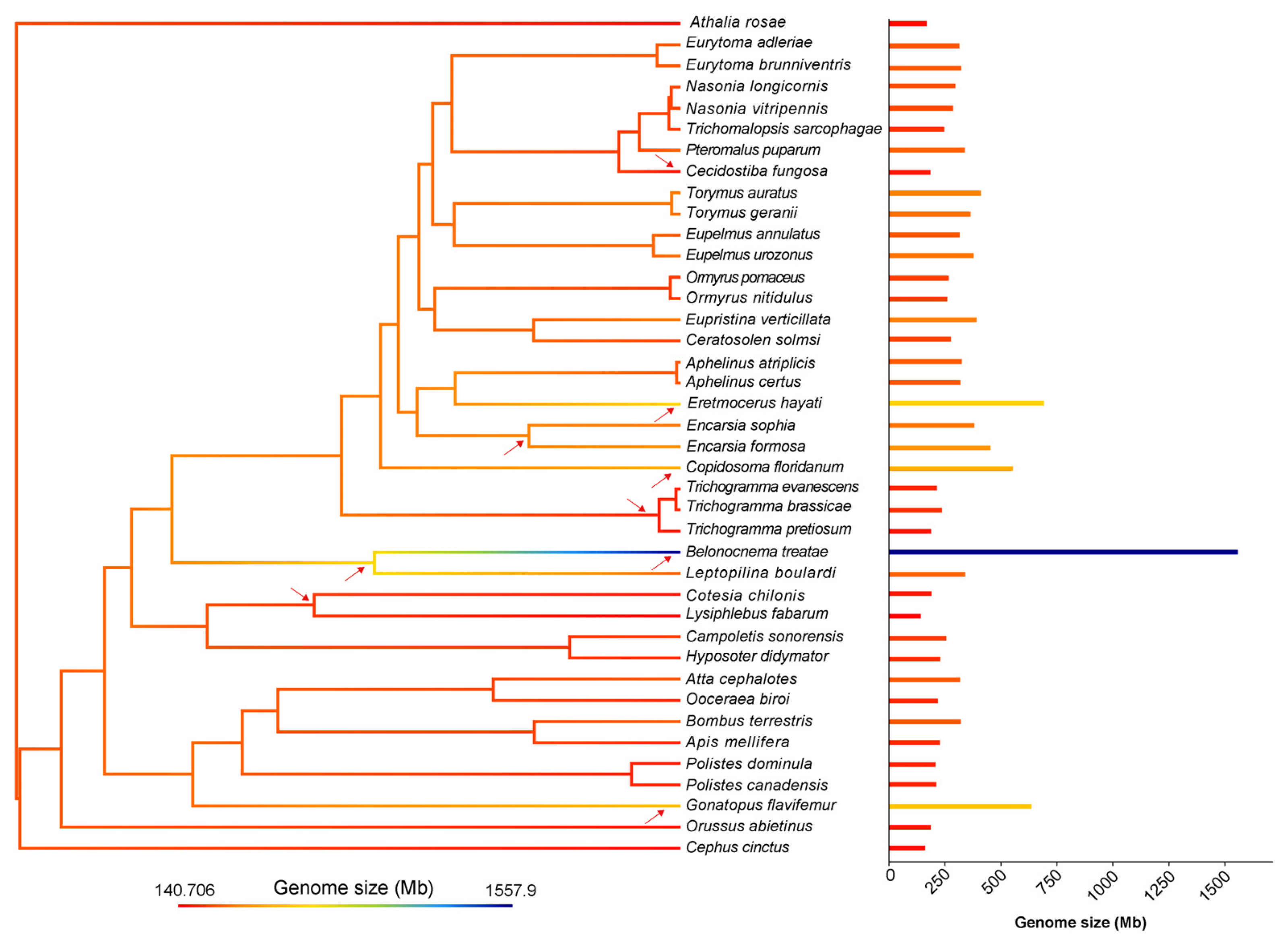Figure 6. Ancestral state reconstruction of genome size across selected Hymenoptera. The phylogenetic tree (left) illustrates the ancestral state reconstruction of genome size, with arrows indicating nodes or branches where notable changes in genome size occurred. The bar chart (right) displays the genome size of each species included in the analysis.