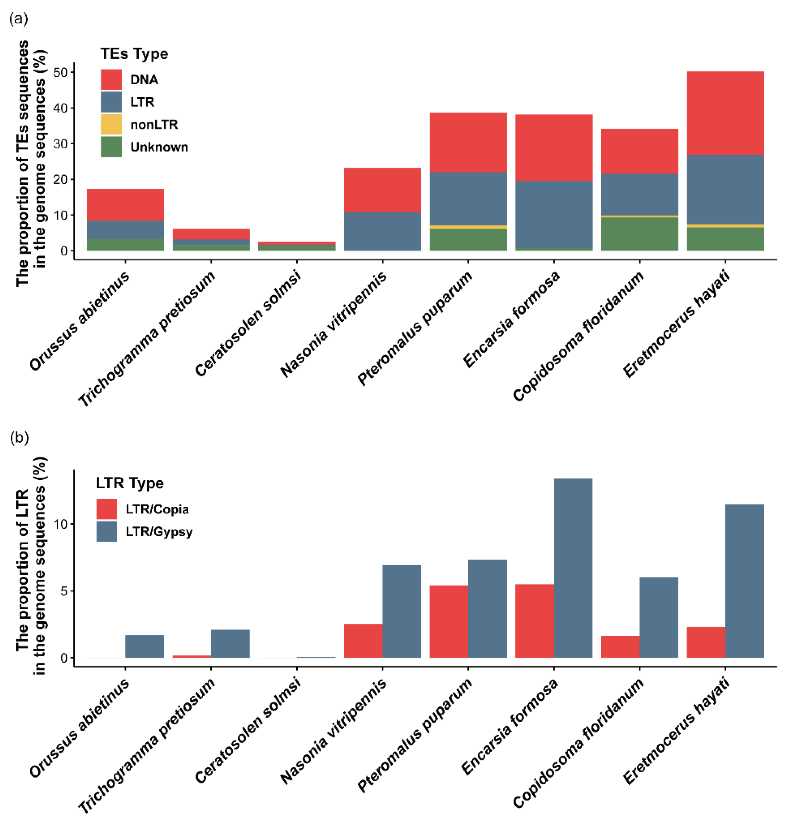 Figure 7. Proportion of repeated sequences in the genomes of different species of Hymenoptera. (a) Visualization of the proportion of various transposon sequences in the eight species. Species are ordered by increasing genome size from left to right. (b) Proportion of the two LTR sequences in the genome.