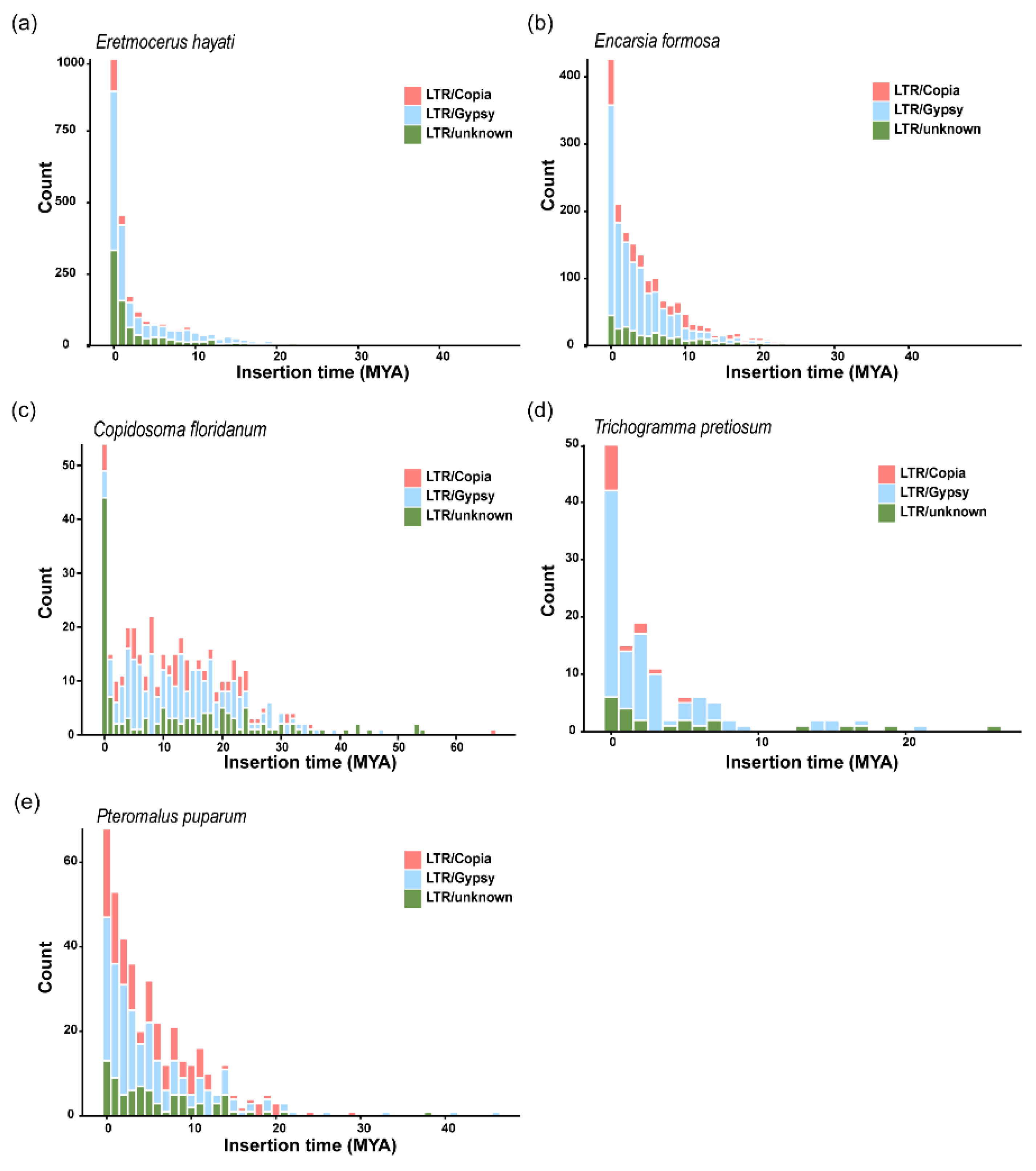 Figure 8. LTR sequence insertion time of five Hymenoptera species. (ae) Number of LTR sequences and insertion time predicted for each species. The vertical axis shows the number of insertions, and the horizontal axis shows the estimated insertion time points. Different colors in the bar chart represent different LTR sequence types.