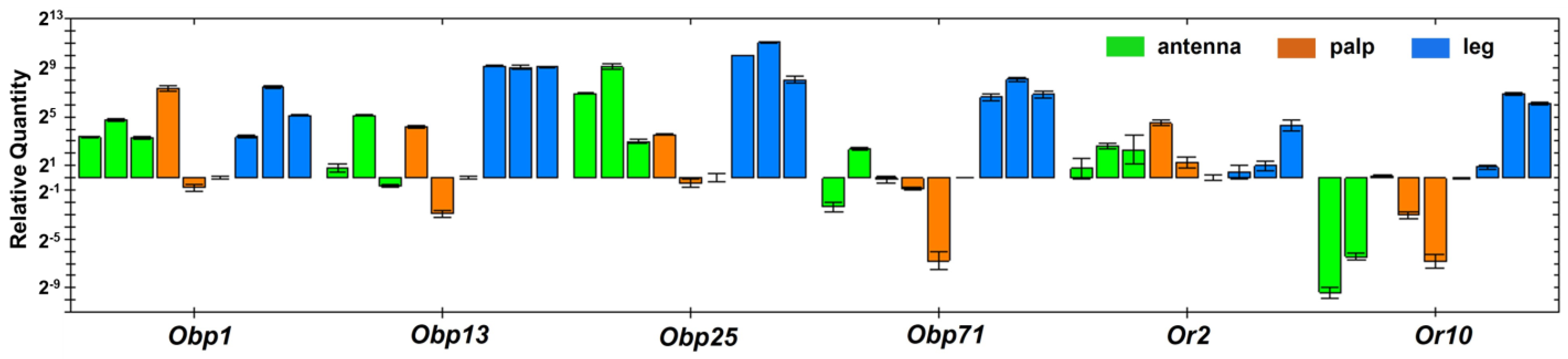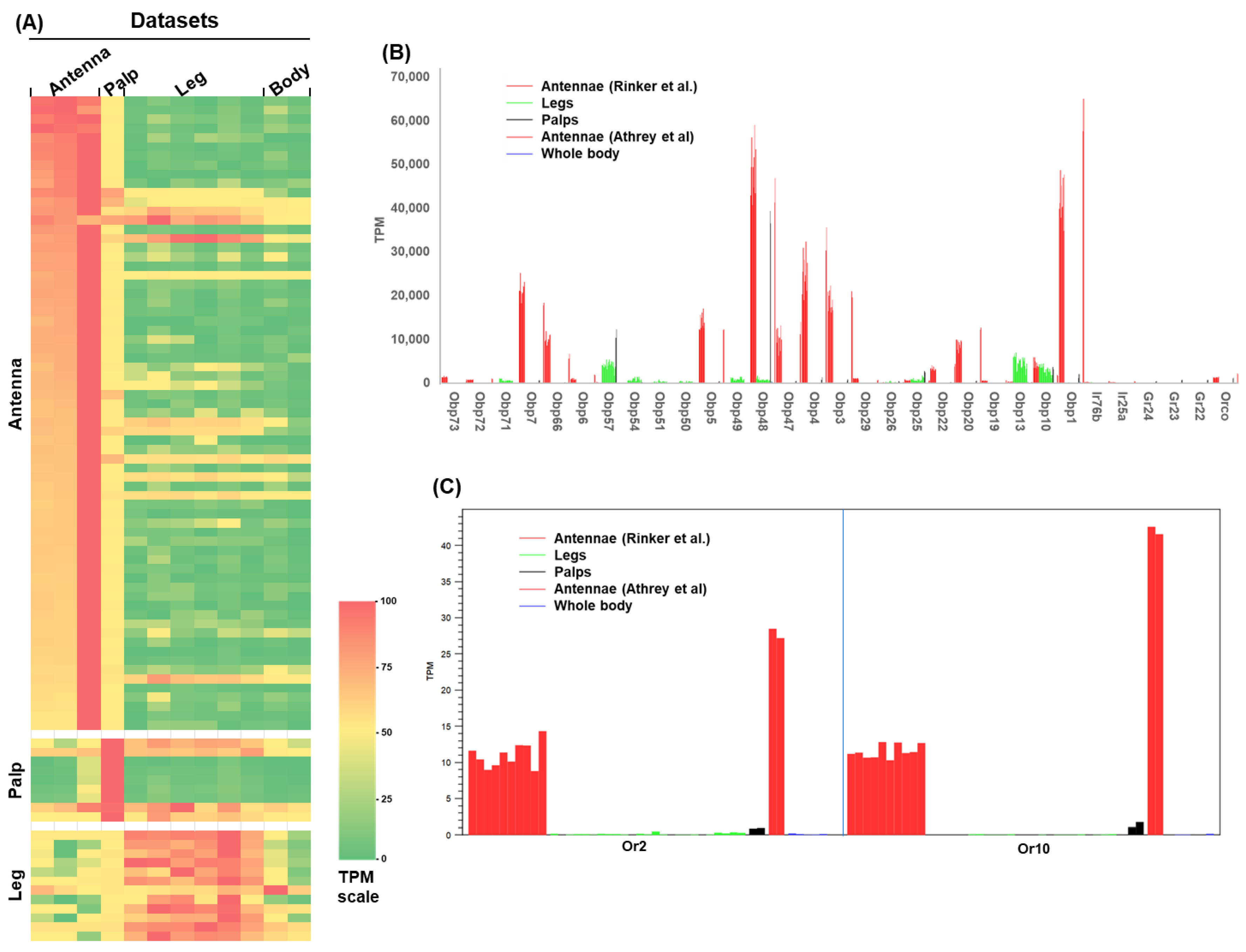 3.4. Transcriptomic Pattern of Chemosensory Genes in Antennae, Maxillary Palps and Legs