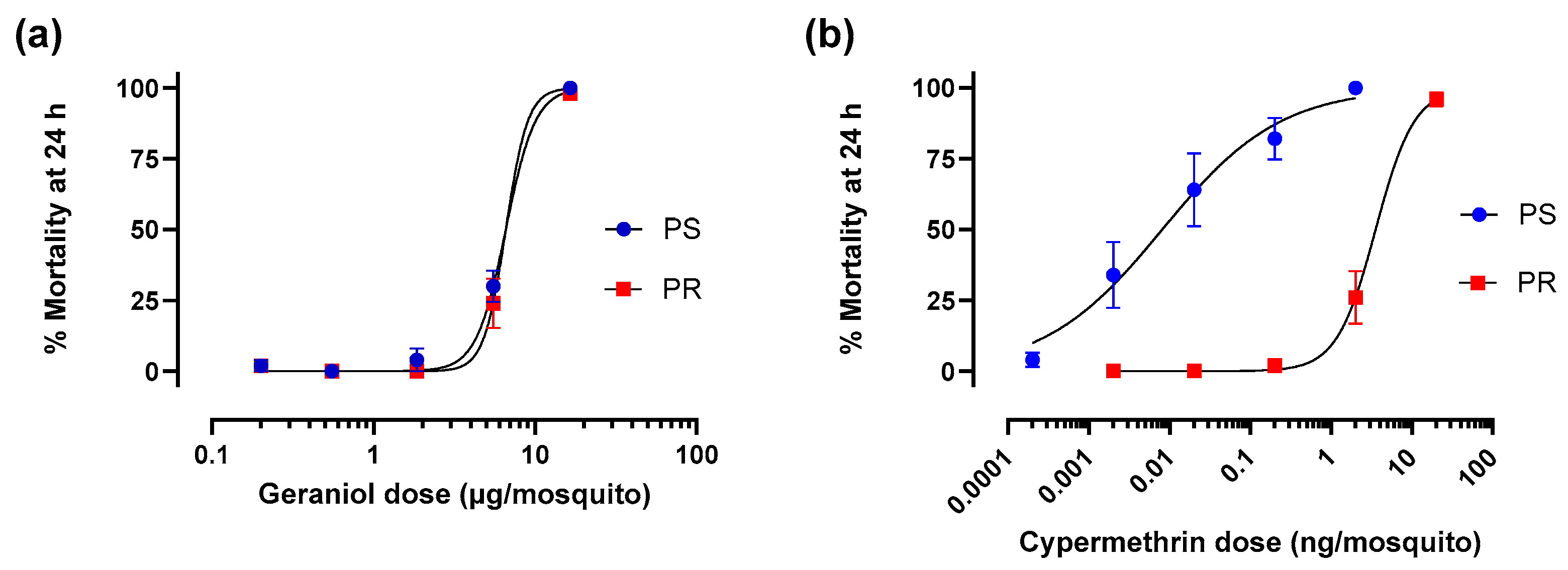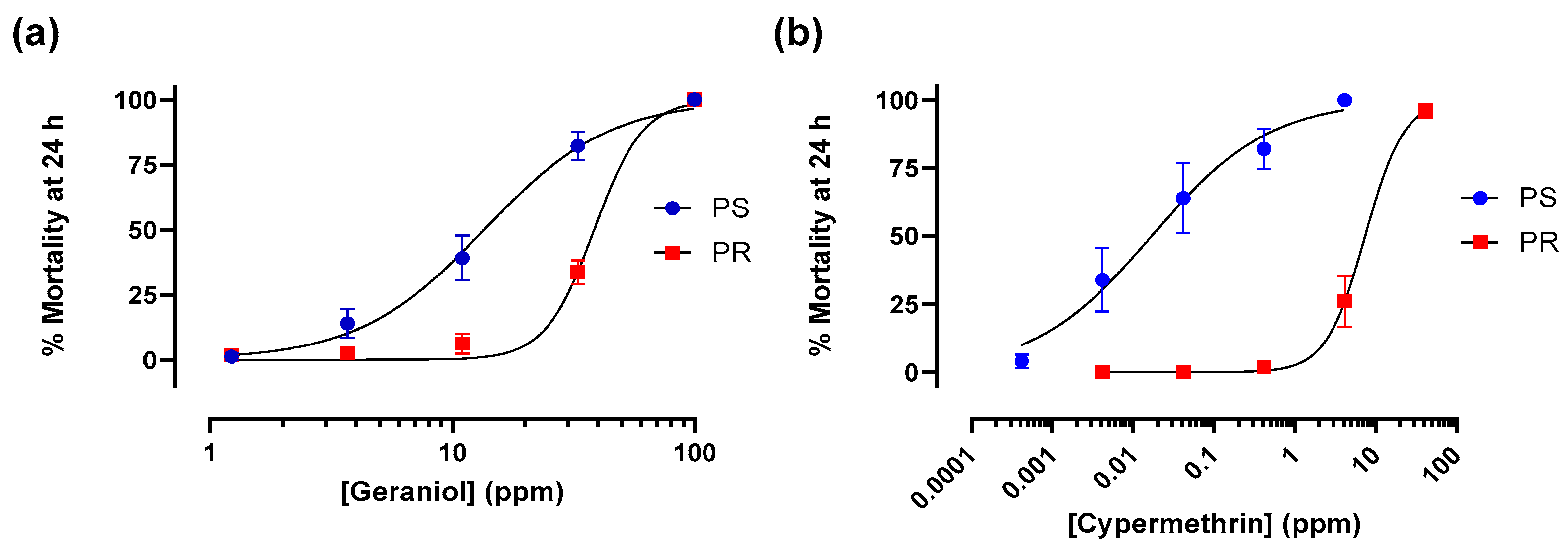 3.2. Toxicity of Geraniol and Cypermethrin to PS and PR Adult Females