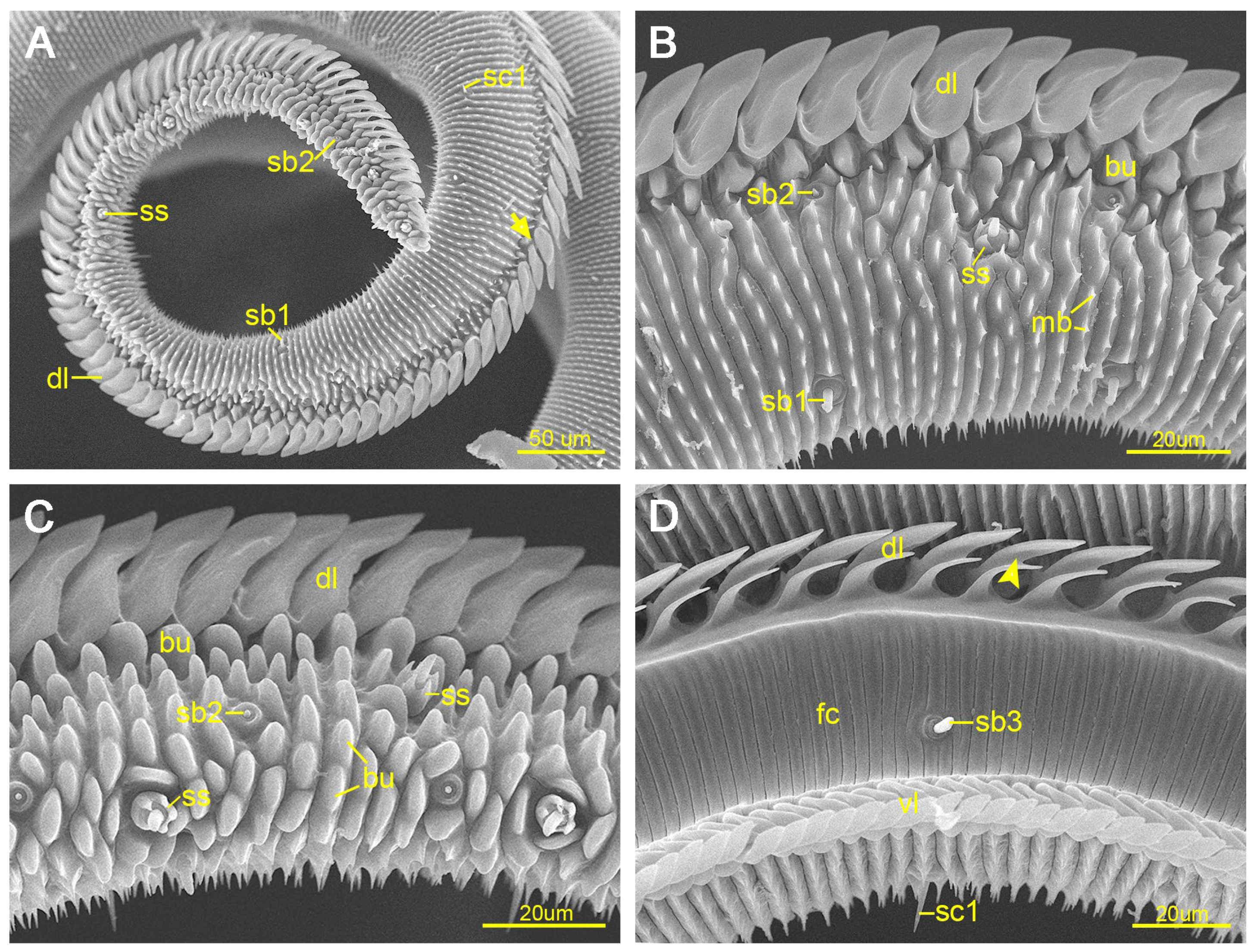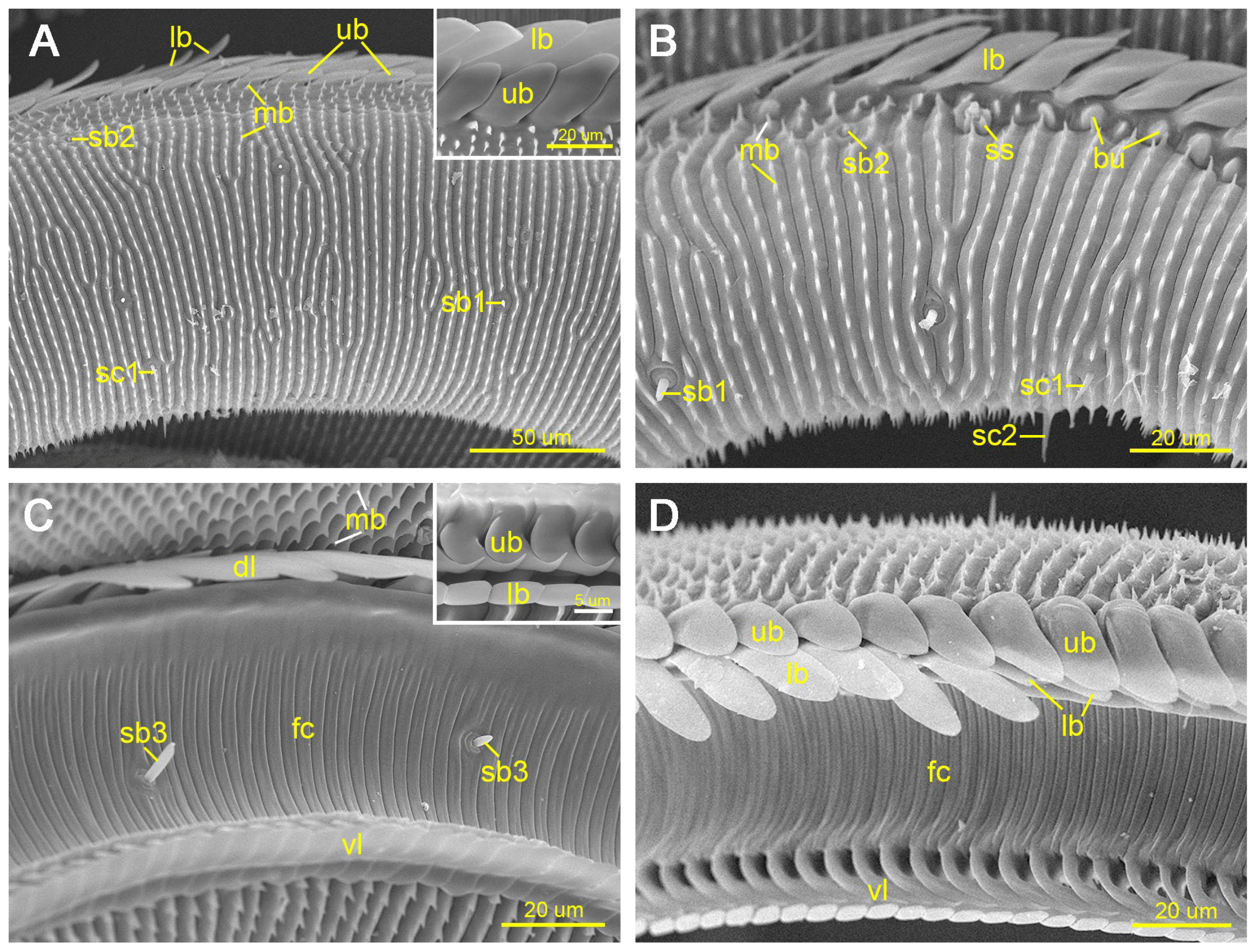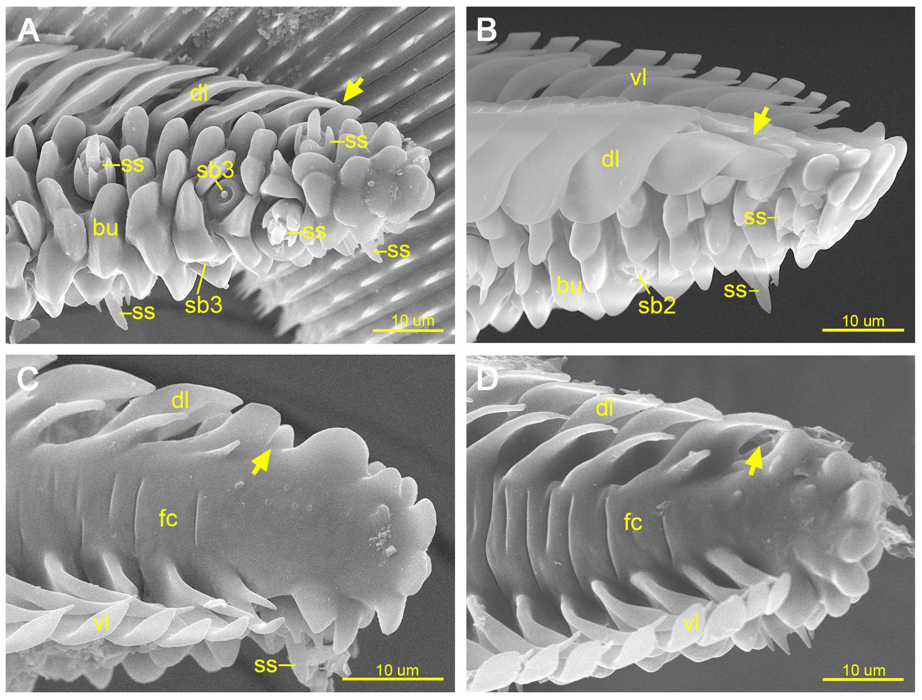 - Yuan, J.Q.; Li, F.F.; Zhu, L.; Zhang, W.; Ma, L.H.; Miao, Y. Scanning electron microscopy of the proboscis and associated sensilla in Colias erate (Esper, 1805) (Lepidoptera: Pieridae). Insects 2024, 15, 922. [Google Scholar] [CrossRef]