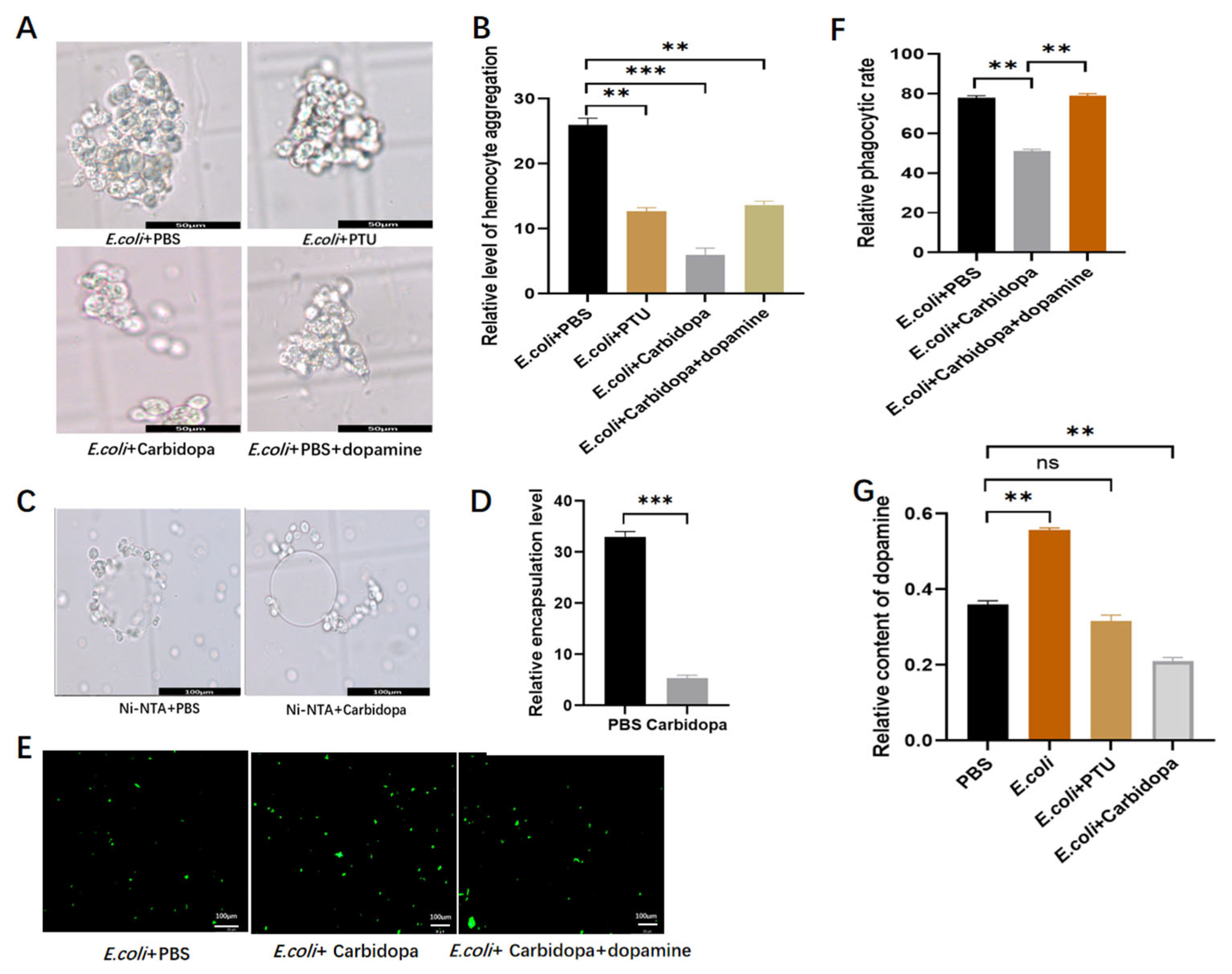 3.3. Effects of Inhibitors on Cellular Responses (Aggregation, Phagocytosis, Encapsulation) and Dopamine Titers
