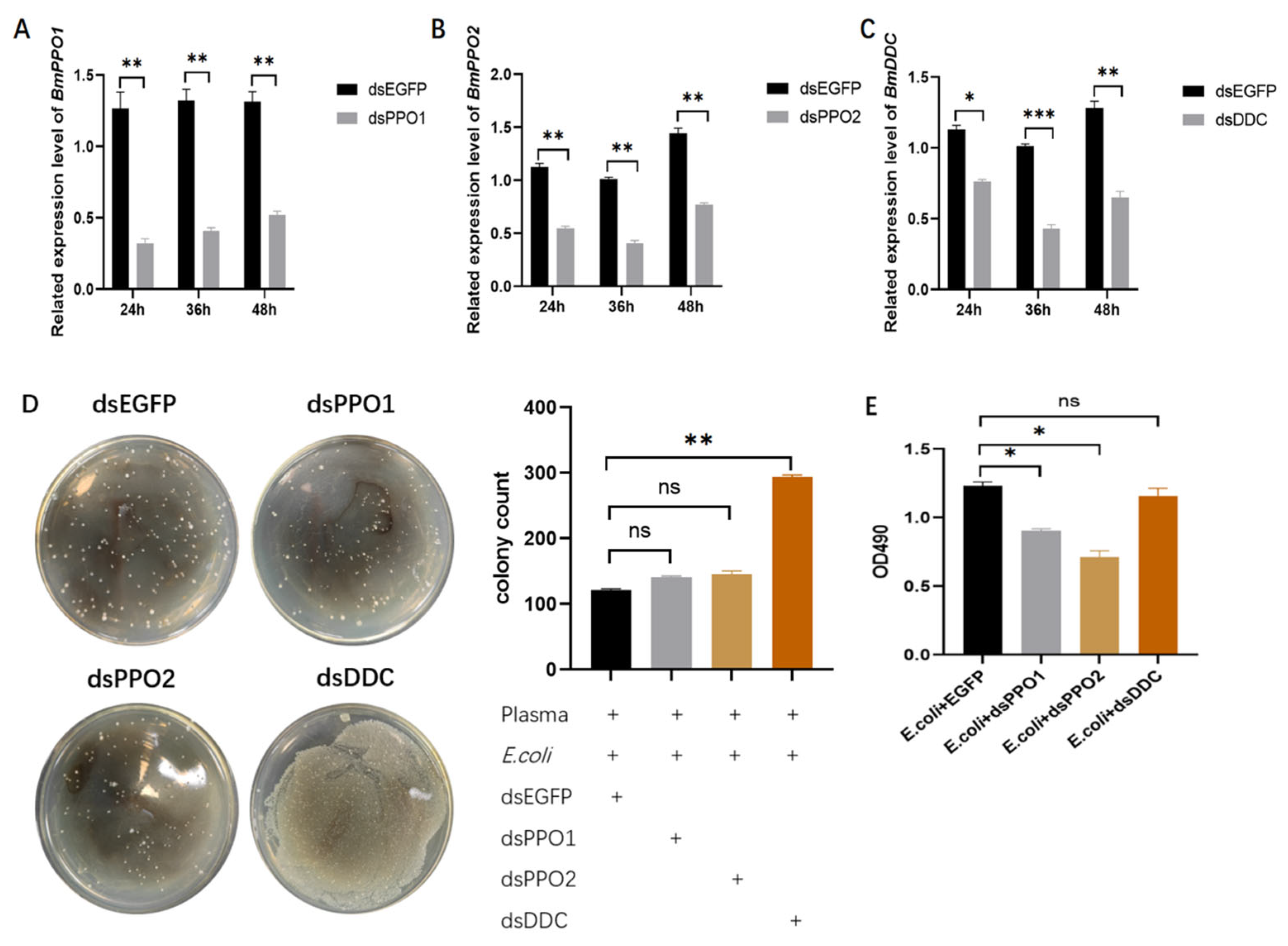 Hu, Z.; Chen, P.; Wang, C.; Chen, P. The Relative Contributions of BmPPO and BmDDC in Immune Melanization of Hemolymph in Silkworm, Bombyx mori. Insects 2026, 17, 405. https://doi.org/10.3390/insects17040405