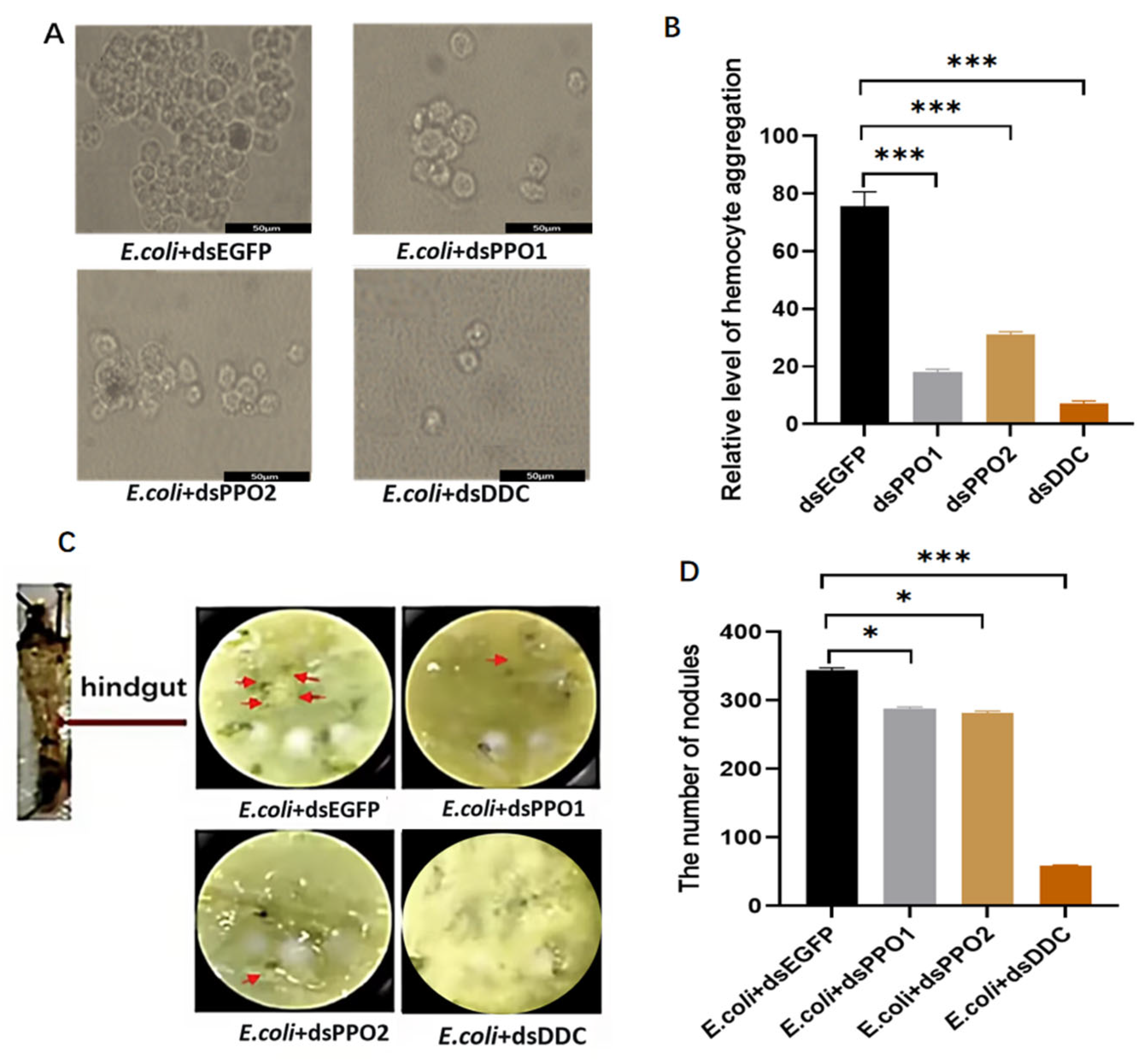 3.5. Effects of Reducing Gene Expression on Hemocyte Aggregation and Epidermal Nodule Formation