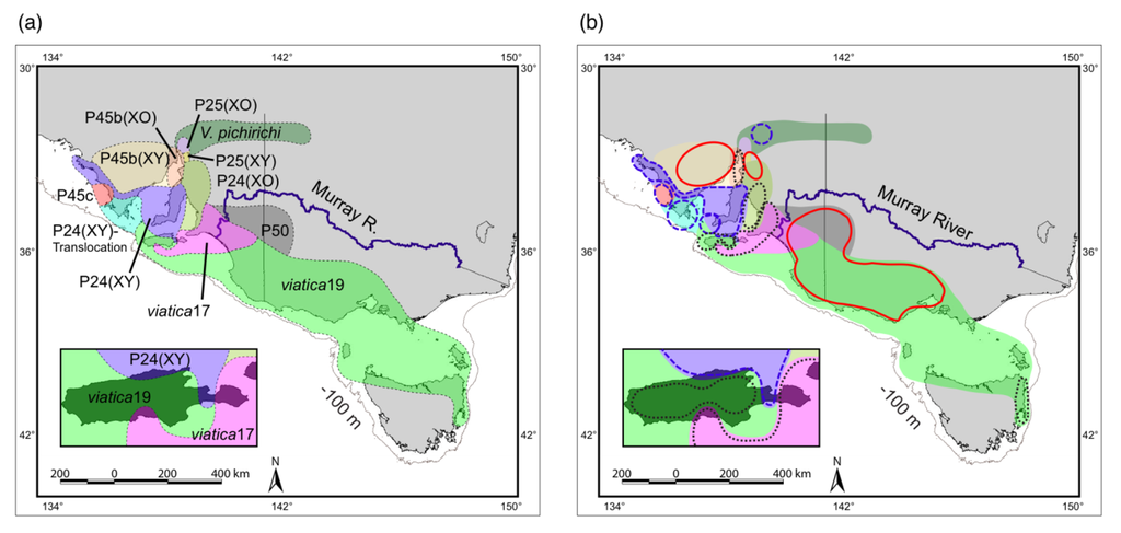 Phylogeographic and population genetic analyses using data from allozymes and two nuclear sequence markers support the involvement of allopatric fragmentation within the viatica species group [31]. For example, viatica19, which has the widest distribution among the Vandiemenella taxa, is composed of multiple, genetically divergent populations (Figure 1b). White [26,45] proposed that this race represents a single ancestral karyotypic lineage based on the comparative cytological studies within the subfamily Morabinae; however, the existence of highly divergent populations particularly at the periphery of the distribution including Tasmania and Kangaroo Island suggests a long-term persistence of viatica19 in geographically isolated populations. Similar genetic subdivision is also revealed within viatica17: one northwest of the Murray River including Kangaroo Island and the other southeast of the Murray River. In addition to the Murray River, active dune fields during recent glacial maxima in the Pleistocene [33] and the ancient Lake Bungunnia occupying the Western Murray Basin about 0.7–3.5 million years ago [46] may have provided a long-term physical barrier to gene flow in this chromosomal race, as found previously in a study of marsupials [47] and, more recently, in the reptile Tiliqua rugosa [48]. Furthermore, high levels of genetic and cytological diversity in the region towards the northwest of the distribution range may be attributable to repeated population subdivisions and range shifts due to sea level fluctuations, and appearance/disappearance of the gulfs and peninsulas through climatic oscillations in this region. These results highlight the clear correlation between boundaries of population subdivisions and biogeographic barriers, but the boundaries of these population subdivisions do not always correspond with parapatric boundaries defined by karyotypes.