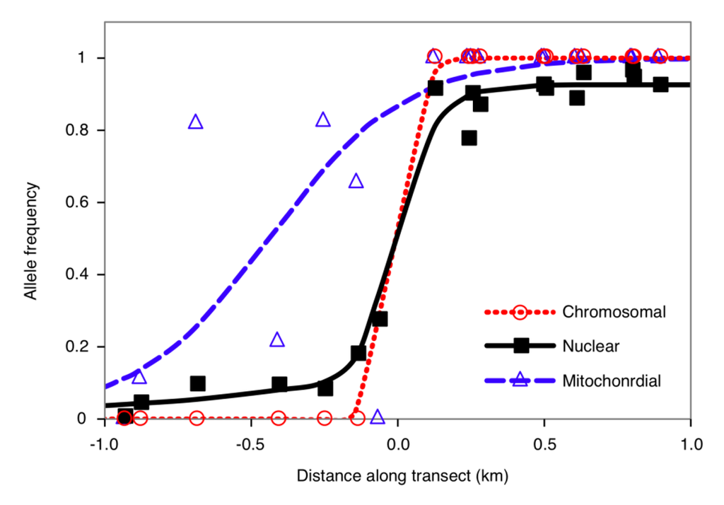 Discordance between chromosomal variation and genetic variation is more pronounced in the mitochondrial genome than the nuclear genome. AMOVA revealed that only 15% of total genetic variation in the COI locus was explained by chromosomal variation [31]. Haplotype network analyses based on the statistical parsimony method (TCS, [37]) showed extensive sharing of haplotypes among multiple chromosomal taxa, while also showing the existence of multiple genetically distinct groups within taxa. Similar to the loci in the nuclear genome, both incomplete lineage sorting and gene introgression can be sources of the discordance between chromosomal and mitochondrial markers. However, hybrid zone analyses suggest weaker barriers to gene flow in the mitochondrial genome than the nuclear genome (see the next section), implying a substantial contribution of gene introgression in the formation of population genetic structure associated with the mitochondrial genome [29].