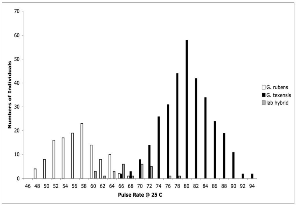 Detailed methodology is provided in [25], but basically what we did was collect adult females from throughout the range of G. texensis, bring those females into the lab, and rear each female's offspring separately. After adult eclosion we recorded the calling songs of males, and we tested females' responses to variation in song. Thus for each wild-caught female we obtained pulse rate data from her sons, and female preference for pulse rate data from her daughters. From these data, for G. texensis, we were able to show (1) that male pulse rate has heritable genetic variation, with h2 roughly 40%, (2) that female preference for pulse rate also has heritable genetic variation, ca. 38%, (3) that there was a significant genetic correlation between male pulse rate and female preference for pulse rate, rG = 0.49, and (4) that neither male song nor female preference for song differed across the geographic range in a way consistent with reproductive character displacement—there was in fact strikingly little geographic variation in G. texensis song and preference. At the time we did not collect enough G. rubens to conduct a parallel test in that species, but subsequent work has shown that G. rubens also lacks reproductive character displacement in male calling song [26] and that extensive field collections show strongly bimodal nearly non-overlapping pulse rates (Figure 1).