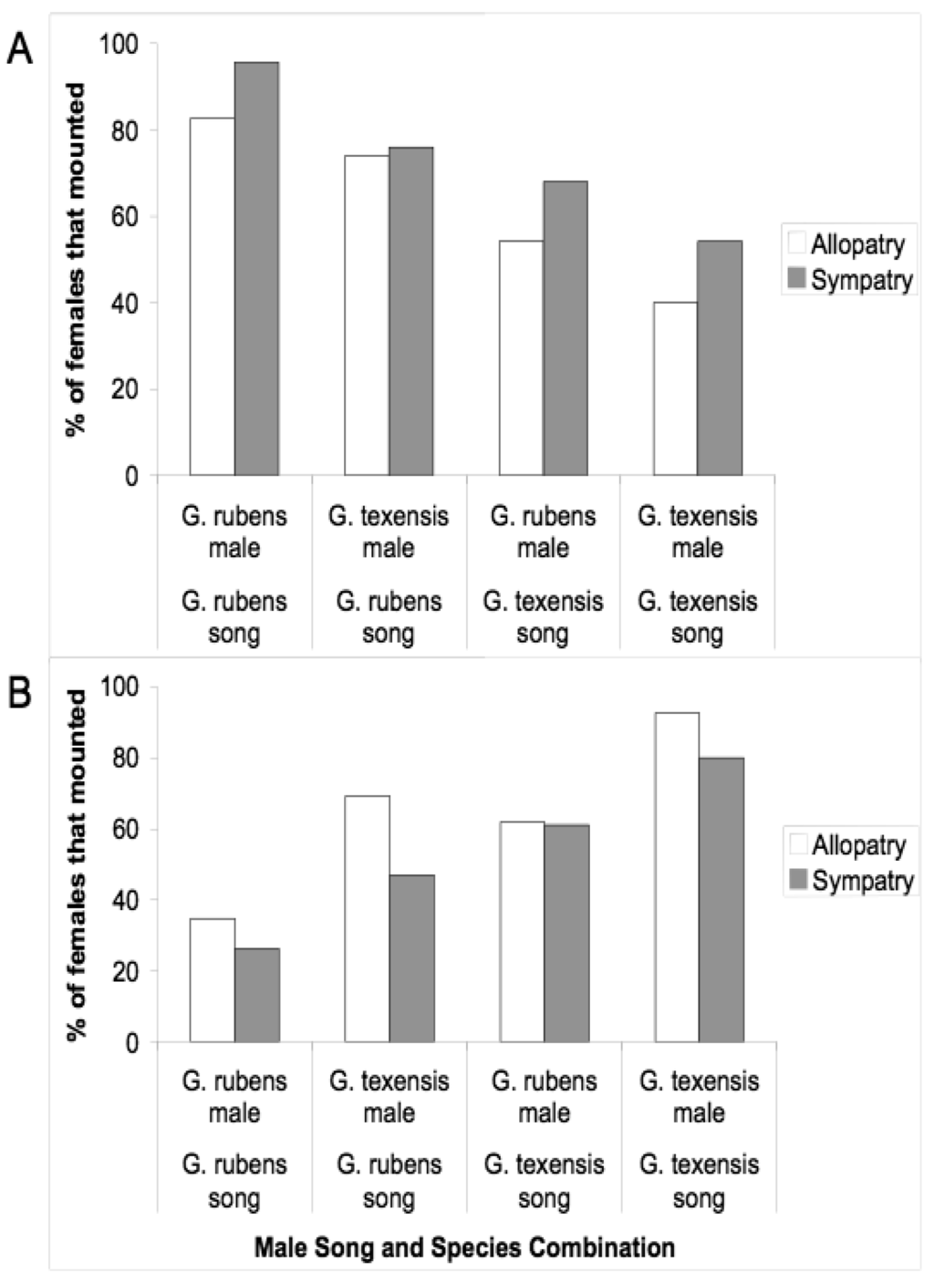 Given that males and females may encounter one another without calling song, we conducted several studies to examine divergence in male courtship song, and in male and female close-range mating behaviors. Courtship song in G. rubens and G. texensis is composed of a series of quieter mostly pure tone lower-frequency ticks (ca. 5 kHz) with louder broader spectrum higher-frequency ticks (most sound energy 11–14 kHz) at regular intervals (Figure 2). Just by recording and analyzing male courtship songs, we were able to show that G. rubens and G. texensis differ in their courtship song rates in a manner that mirrors their calling song pulse rates: G. texensis has faster courtship song than G. rubens [50], and experimental manipulation of the diet showed that courtship song features did not appear to reflect male nutritional condition [51]. Based on this, my lab conducted two separate studies of close-range courtship and mating behavior with these species. The first [52], used muted males with virgin females of both species. Males that courted females, although themselves mute, were accompanied by a synthetic species average courtship song played via a tweeter directly under the pair of crickets. Thus males had the opportunity to court females, or not, and females had two experimentally separated sources of information about male species identity (1) from their cuticular hydrocarbons (unmanipulated) and (2) from the accompanying courtship song (manipulated). I replicated the entire experiment with crickets from allopatry and sympatry, using G. texensis from Austin, Texas and Tuscalloosa, Alabama, and G. rubens from Gainesville, Florida, and from Tuscallosa, Alabama. In short, the results showed separate significant effects of male species identity and courtship song played on the likelihood of female mounting; there was no difference in either species between the behaviors of crickets from sympatry and allopatry (Figure 3). Although these results show divergence in close-range courtship mating behaviors, they also notably show that despite significant species effects, the potential for hybridization is not trivial—on the assumption of no prior female phonotaxis to male calling song.
