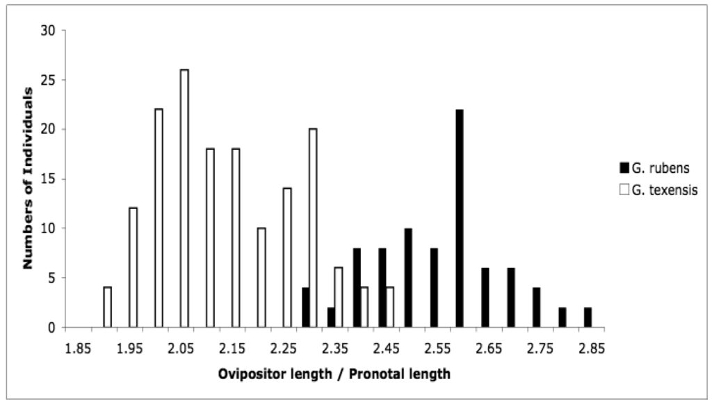 At the time that Bill Cade and I started our character displacement study, there were no known morphological means of distinguishing between these two species. That situation is unchanged for males, however during our work we observed that female G. rubens appeared to have longer ovipositors relative to body size than did female G. texensis. To confirm this, we measured ovipositor length and pronotal width, and we found that females were in fact quite strongly divergent in relative ovipositor length [67]. In particular, if we make a histogram of ovipositor length divided by pronotal width, we see imperfect but bimodal separation (Figure 5). Ovipositor length in crickets is clearly an ecologically linked trait; effects of phylogenetic history, latitude, egg size, oviposition behavior, diapause strategy, and soil type have all been described [68–73]. G. rubens and G. texensis share their deeper phylogenetic history, are found at similar latitudes, and both have facultative nymphal diapause with no egg diapause observed. Egg size, oviposition strategy, and soil preferences have not been examined, but G. rubens, in Florida and the southeastern coastal areas especially, experiences sandier soils than elsewhere throughout the species' ranges. Sandy soils drain and dry quickly compared to more loamy or clay-laden soils, and crickets are known to oviposit deeper in dryer sandy soil [73]. The congeneric species pair, G. firmus (known as the ‘sand field cricket’) and G. pennsylvanicus show a similar pattern: both have recent shared evolutionary history, both are egg diapausing species, but G. firmus has a considerably longer ovipositor than the more inland G. pennsylvanicus [71,74]. Ovipositor length thus appears to be an indicator of adaptive ecological divergence between G. rubens and G. texensis. This would be especially true for G. rubens populations in the southeastern US coastal areas, including peninsular Florida.