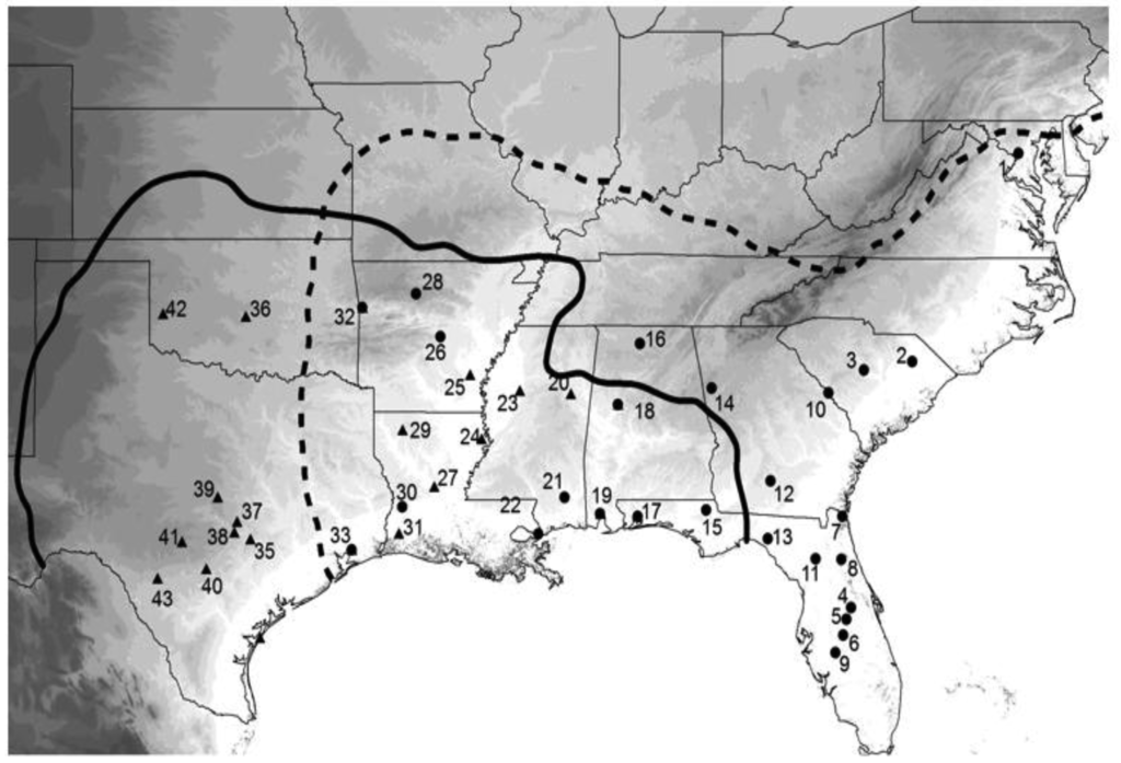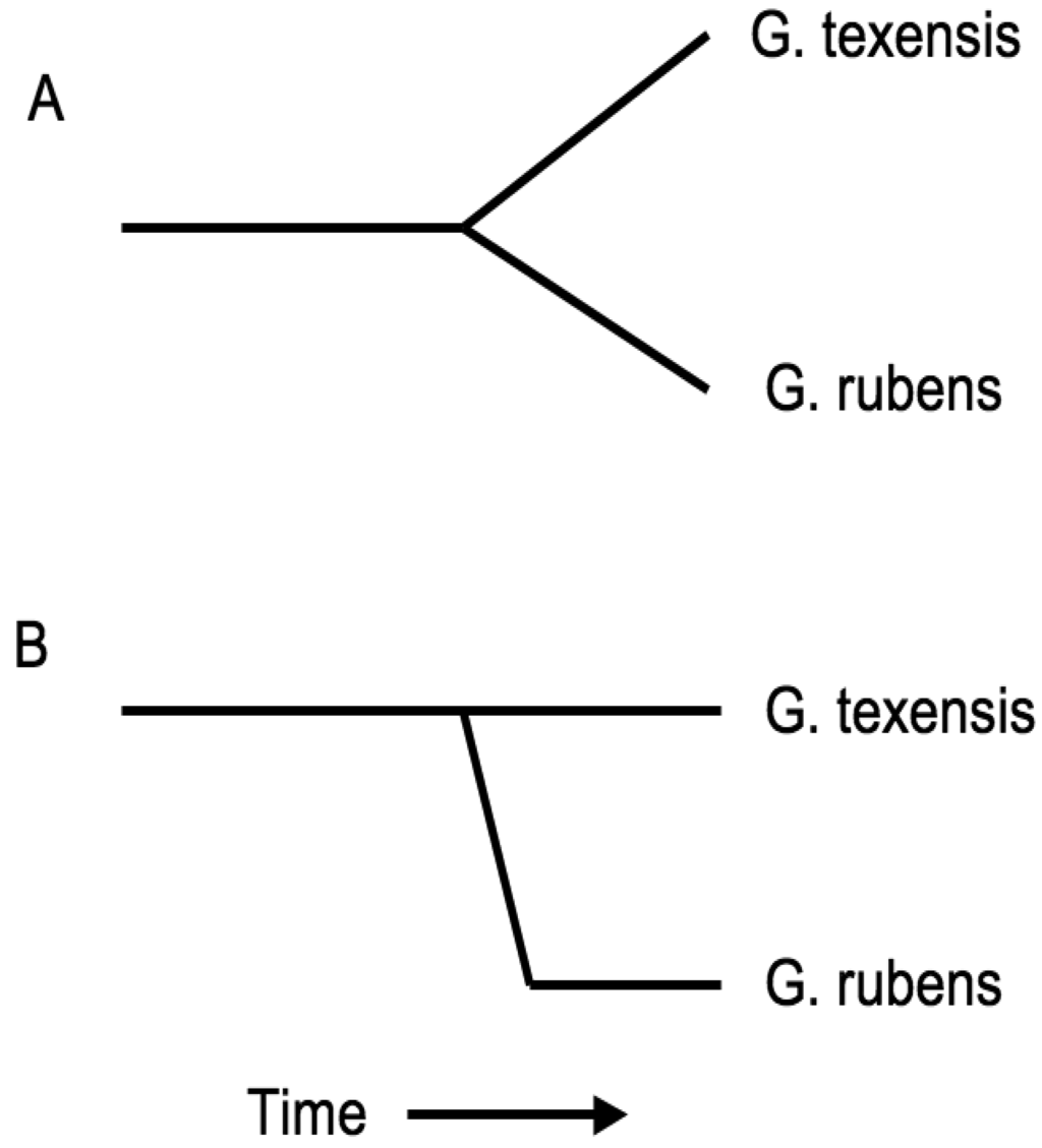 Our first study was with the mitochondrial Cytochrome c Oxidase I (COI) and cytochrome b (CYT-B) genes. It showed that G. texensis had much higher levels of genetic variation than did G. rubens, that the gene trees showed species level separation, but were not reciprocally monophyletic, and that G. rubens appeared closely related to only one subset of the G. texensis variation [75]. That study consisted of only 10 individuals for each species, but the essential results were all later confirmed in a much larger analysis (see below) and our genetic variation results were concordant with previous work showing low levels of genetic variation in G. rubens [76]. Although informative, this first data set was nonetheless insufficient for large scale phylogeographic analysis.