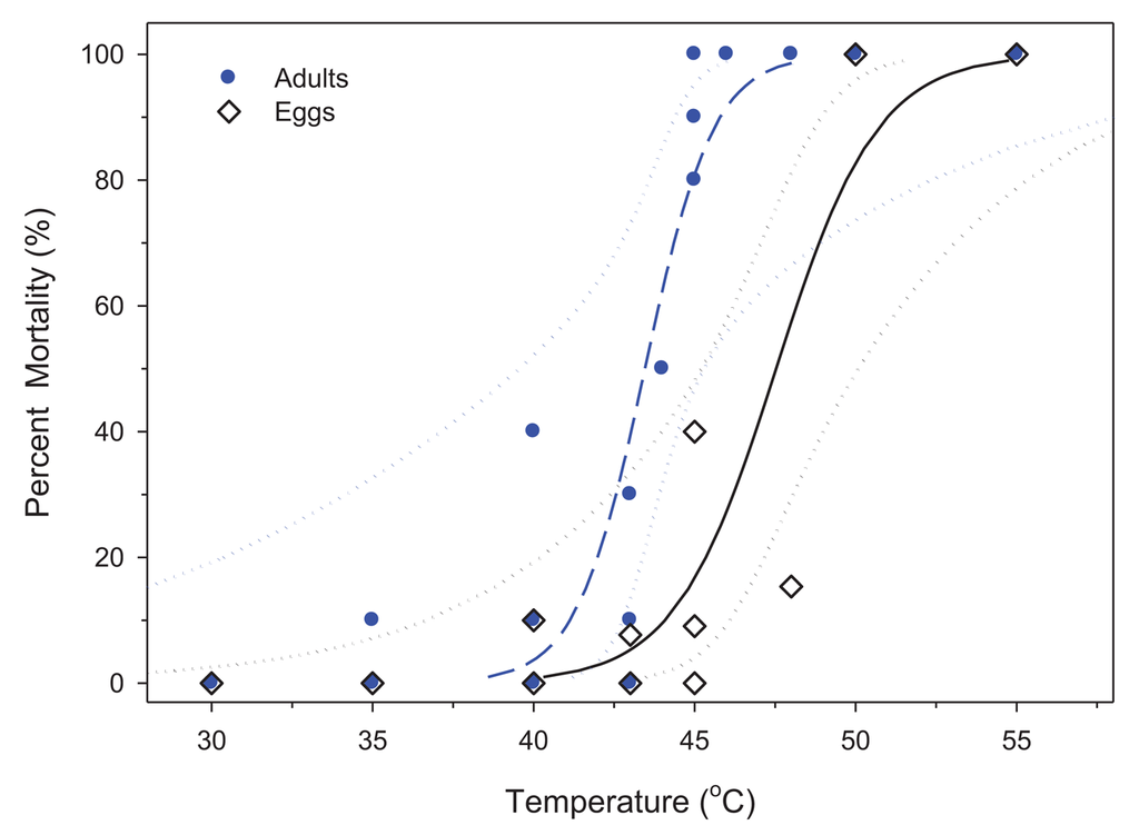 For LTemp, mortality was first observed at 40 °C and reached 100% mortality at 50 and 55 °C (Figure 1). The LTemp50,99 between fed and unfed adults was not significantly different, so the data were combined (data not shown). For adults, the LTemp50,99 was 43.5 °C and 48.3 °C, respectively (Table 1). Eggs had a higher LTemp50,99 of 47.5 °C and 54.8 °C, respectively (Figure1, Table 1).
