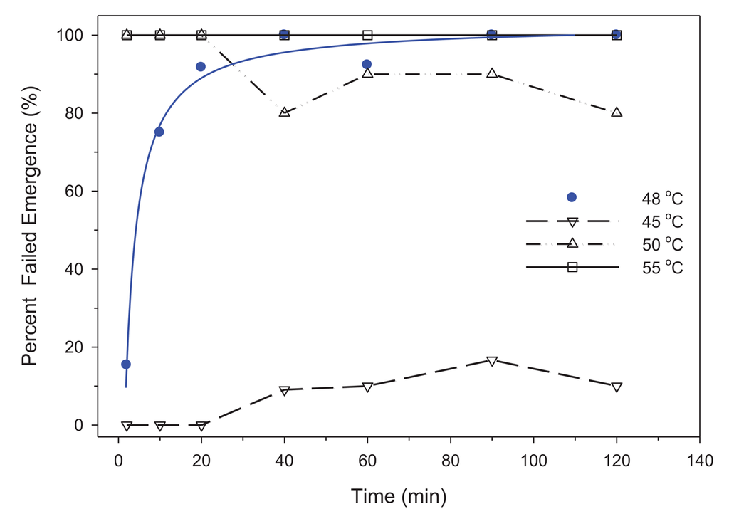 The threshold temperature was 48 °C for eggs. Failed emergence of eggs was <20% for temperatures below 48 °C and with 2 h of exposure (Figure 3). Exposure of eggs to 48 °C resulted in a hyperbola relationship for failed emergence rather than the standard sigmoidal relationship used by Logistic analysis. As a result, a three-parameter hyperbolic regression produced the following equation with an r2 = 0.99 (n = 7):