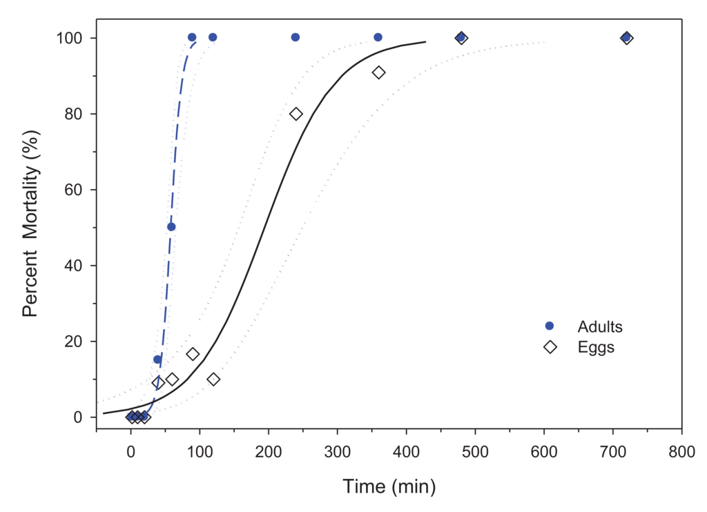 In this study, bed bug eggs survived 120 min at 45 °C with minimal mortality, while adults failed to survive beyond the 2-h exposure time (LTime99 = 94.8 min). To determine the effects of extended exposure, adults and eggs were exposed to 4, 6, 8 and 12 h in addition to previous time points. With significantly longer survival times compared to adults at 45 °C, the LTime50,99 for eggs was 194.1 and 428.5 min, respectively (Table 2, Figure 4).