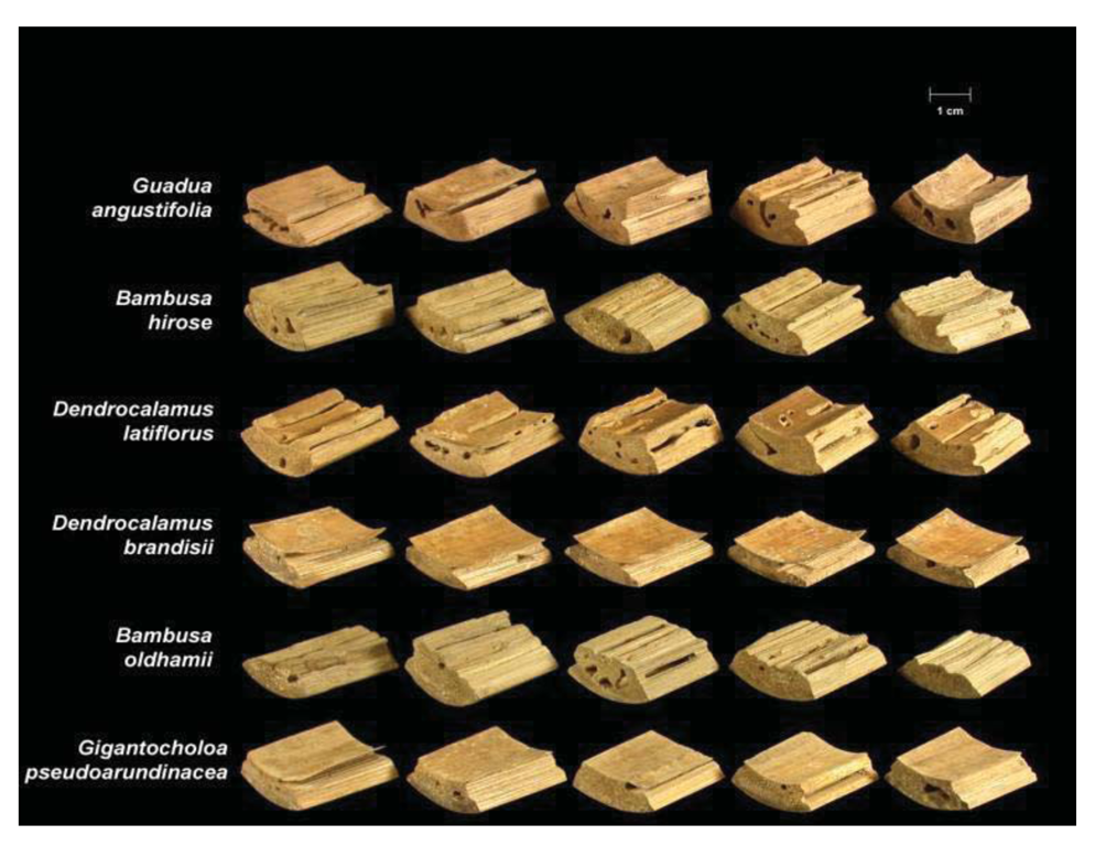 Samples were cut from six species of bamboo using a band saw. Although the outer wall of the samples varied in thickness, samples were cut to include both outer and inner surfaces, and each test sample was approximately 25 mm (1 inch) by 25 mm (1 inch) by 6 mm (1/4 inch). All samples were autoclaved (Getinge Auto Clave, Gettings USA, Inc, New York) at 256 °C and 20 PSI for 60 min to remove molds. For each bamboo species there were five replicates and three environmental controls (exposed to the same test conditions, but without termites). All samples were dried in a drying oven (calibrated with a Salvis thermometer) at 90 °C for 24 h and allowed to cool to room temperature in a desiccator for one hour. Dry samples were weighed using a Mettler AE 163 balance.