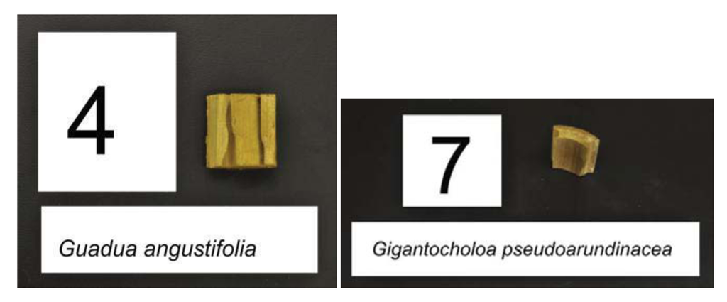 A no-choice, or single choice, test, described as a standard method in Standard E1-09 of the American Wood Protection Association (AWPA 2009), was used to assess the levels of resistance to termite attack of six different bamboo species grown on Maui, Hawaii, namely Bambusa hirose (BH) (Hirose's bamboo), Bambusa oldhamii (BO) (Oldhami bamboo/giant timber bamboo), Dendrocalamus brandisii (DB) (sweet dragon bamboo), Dendrocalamus latiflorus (DL) (sweet giant bamboo), Gigantocholoa pseudoarundinaceae (GP) (great giant bamboo), and Guadua angustifolia (GA) (“guadua”). All bamboo samples were provided by Whispering Winds Bamboo, Hana, Maui.