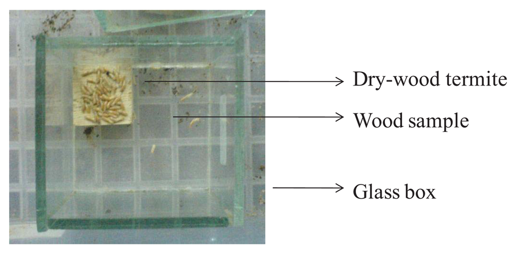 The chemical solution used in this study consisted of a combination of sodium bichromate, copper (II) sulphate, Niccotiana tobaccum and Eugenia carryophillata extracts. Test blocks were exposed to a dry wood termite forced-feeding test according to Indonesian National Standard (SNI) 01-7207-2006 [3] Wood samples (2 cm × 2 cm × 1 cm) treated with the chemical substance solution at 10 ppm CC-organic compound (1:1), were placed in glass box size 4 × 4 × 4-cm with 50 workers of dry-wood termite (Figure 1) and the experiment was replicated 3 times. Termite mortality was observed once per week for 6 weeks and termite mortality and weight loss of wood sample (rubber wood) was determined at the end of observation.