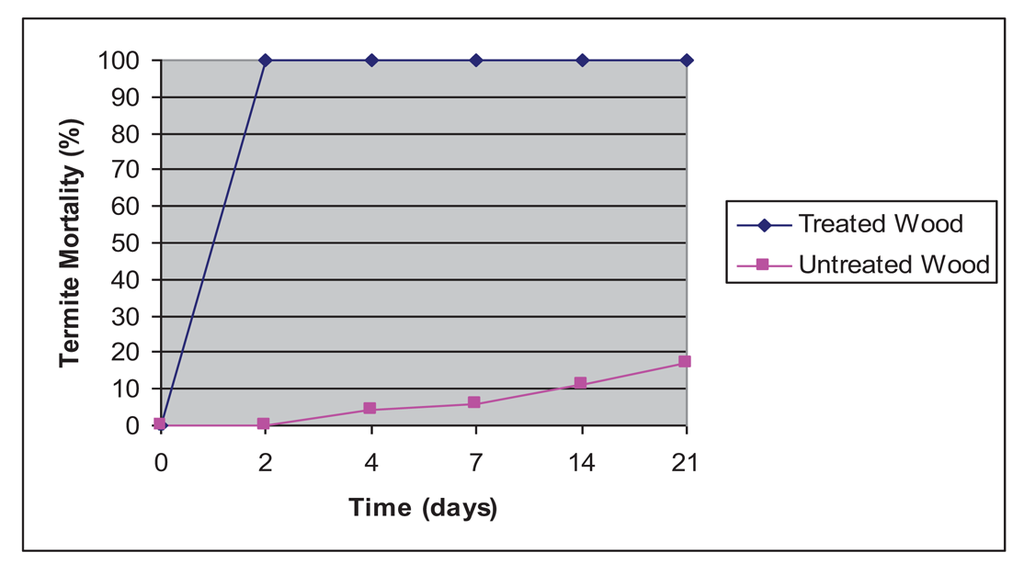 Termiticide activity of the C-C organic compound solution was indicated by the termite mortality data. Figure 2 shows the average value of termite mortality on treated and untreated wood. The rubber wood control showed 17% termite mortality at day 21 while, by the second day of testing, all treatments resulted in 100% mortality.